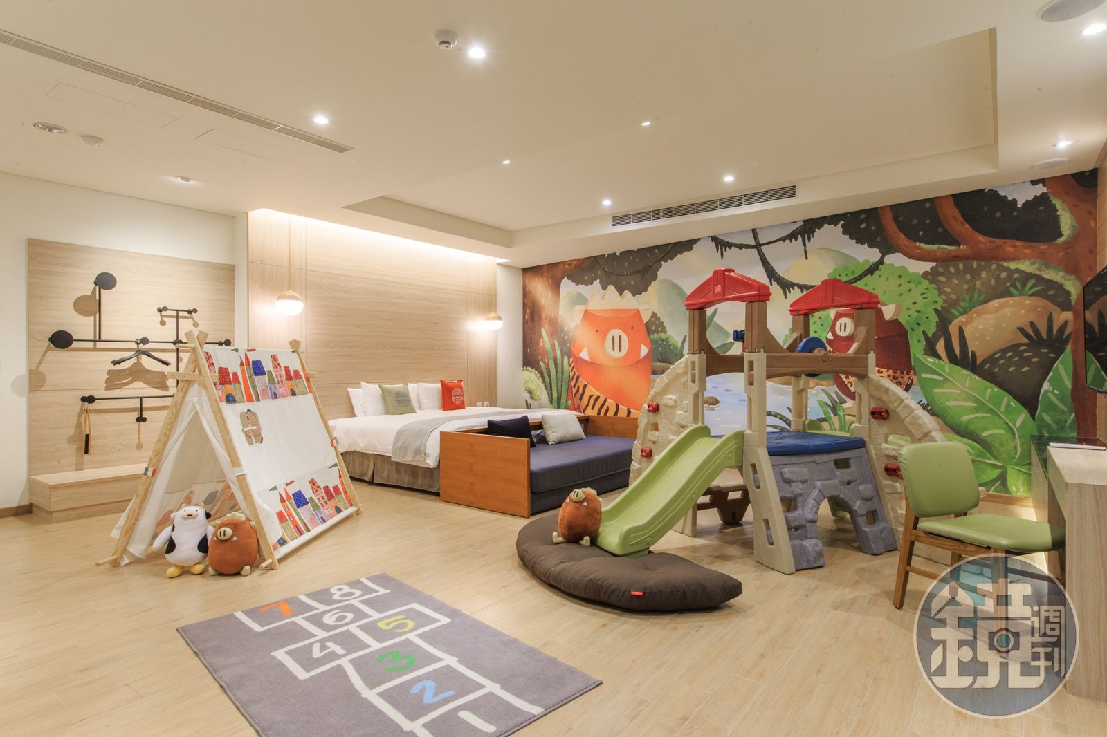 「輕逸豪華客房」則有26坪的寬大空間,可擺放一張大床和2張單人床,另附設專屬獨立車庫,彷彿入住私人會館,房內還布置小型遊樂空間,提供小帳棚、溜滑梯、跳格子遊戲地墊等,打造輕鬆愉快的住宿氛圍。