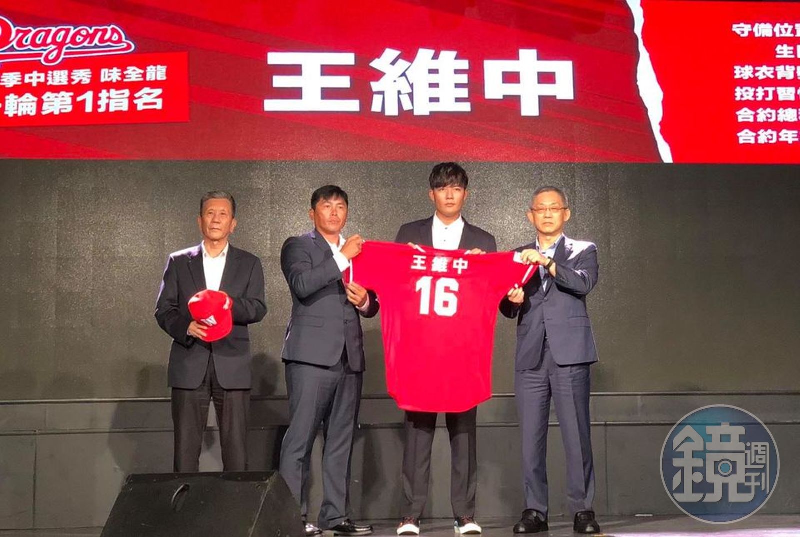 味全龍隊今天正式公布王維中的合約細節,王維中的合約為5年3個月,以總額208萬美元(約新台幣6,126萬元)的史上最高價簽下,超越2016年林智勝的新台幣4,500萬元。 王維中是中職季中選秀7年來首位投手狀元,也是中職史上首位左投狀元,而味全龍董事長徐文芳透露,狀元合約能圓滿簽約,也是因雙方都有極高誠意,加上創辦人魏應充決心要為台灣職棒環境留才。 王維中表示,「感謝魏應充創辦人及球團,很高興加入味全龍,我會全力以赴,希望能跟球隊一步一步邁向總冠軍,也謝謝球迷朋友們的支持。」
