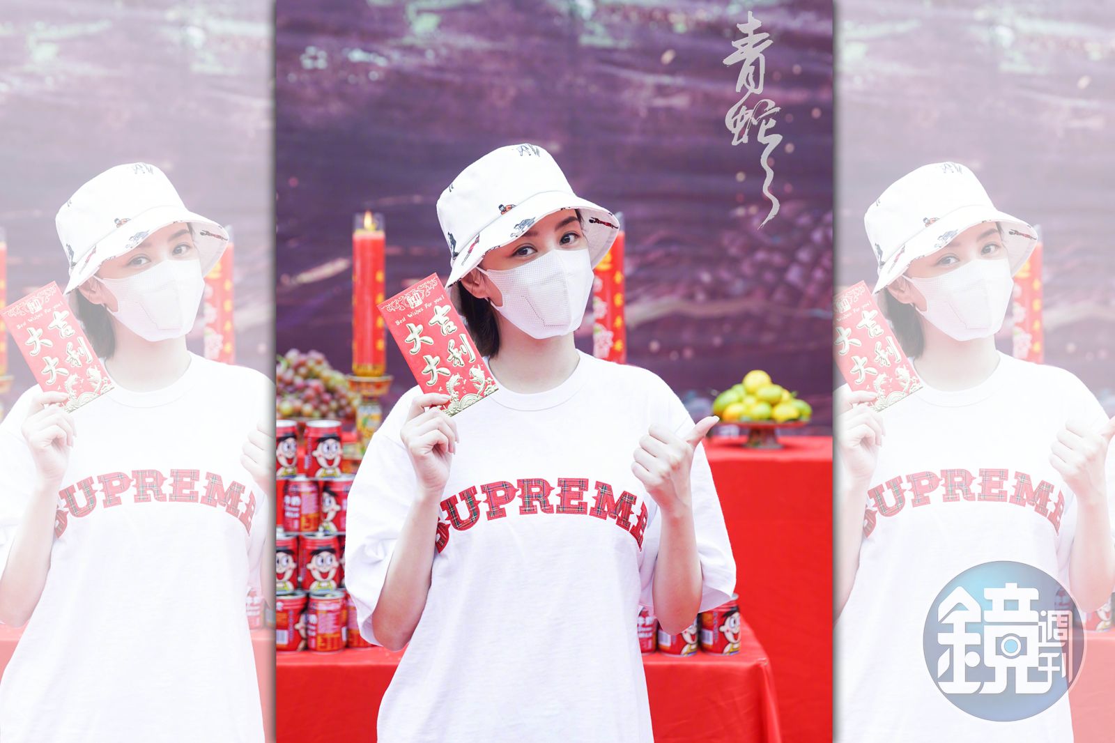 才剛康復的阿嬌穿上白寬鬆大T-Shirt、戴著口罩和漁夫帽,把整張臉遮住,只露出一雙大眼睛。照片上的她顯得精神不錯,為了不想傷口曝光,阿嬌刻意運用帽沿遮擋右側眉角,拍照時也儘量偏著頭,儘量只呈現漂亮完美一面。