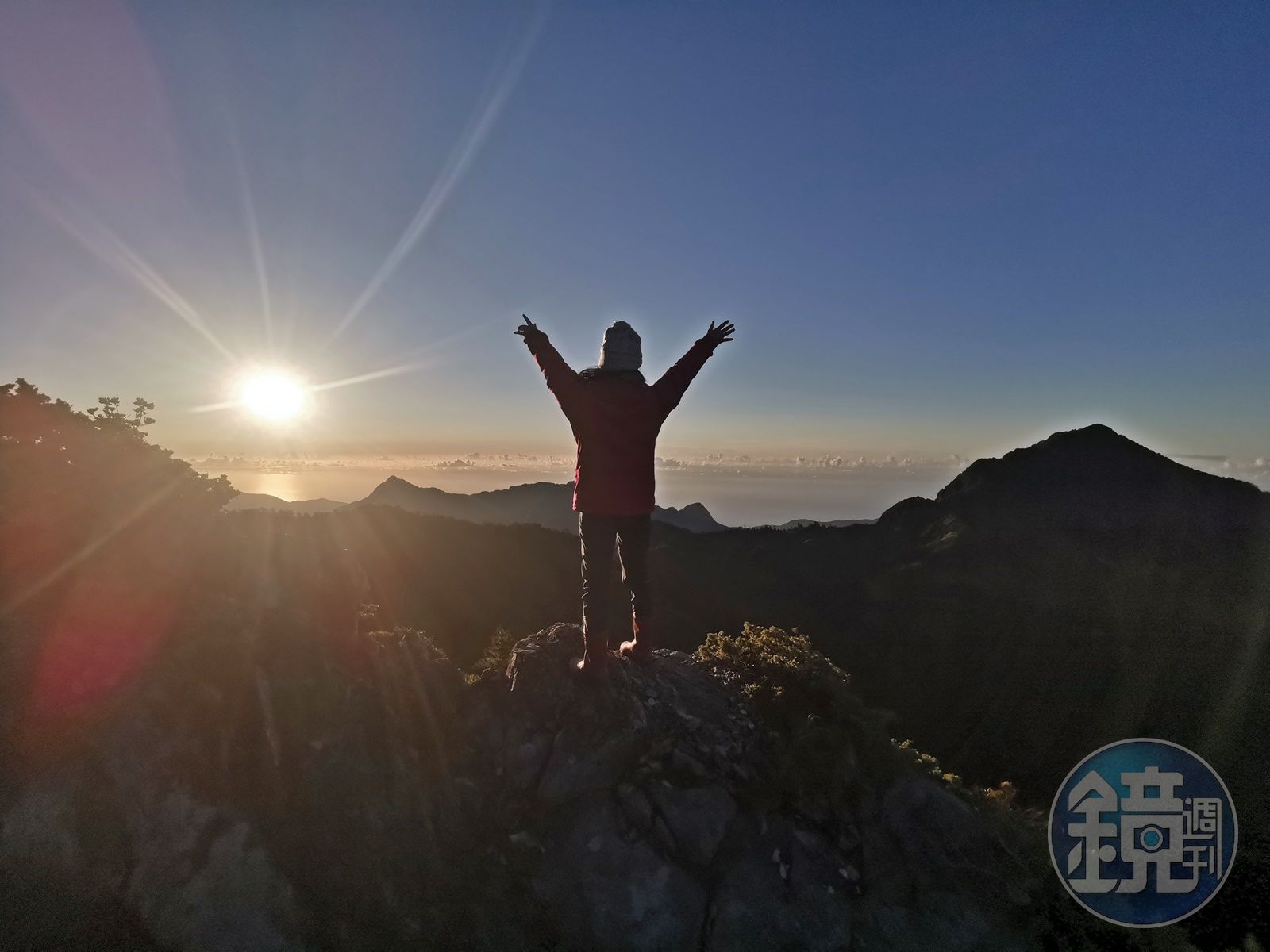 由於前一天下雨,我們迫降在往廣寒宮的山腳下紮營,無緣見到月光照射廣寒宮的景象,當快登上廣寒宮時,太陽從東邊升起,那道暖陽永遠是行山者最愛的景象,充滿希望也預告今天的好天氣。