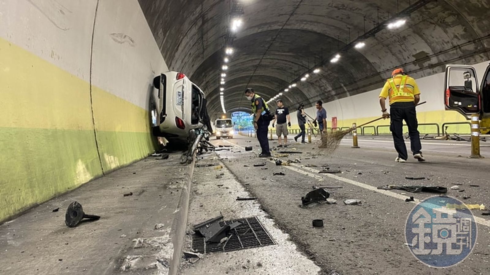 警消凌晨4時50分獲報,到場看見一片狼藉,隧道內部散落大量車體及護欄碎片,機油流滿一地,車身扭曲變形,幸運的是陳姓駕駛僅受全身輕微挫傷,酒測數值高達0.69mg/L,警方將依公共危險罪依法究辦,另外也會向他求償隧道內損壞的護欄等物。