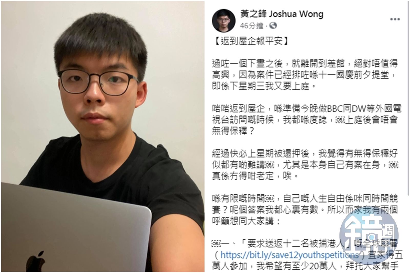 黃之鋒今(24日)被拘捕獲保,稍早在臉書PO文報平安。(翻攝自黃之鋒 Joshua Wong臉書)發布時間:2020.09.24 19:50 臺北時間