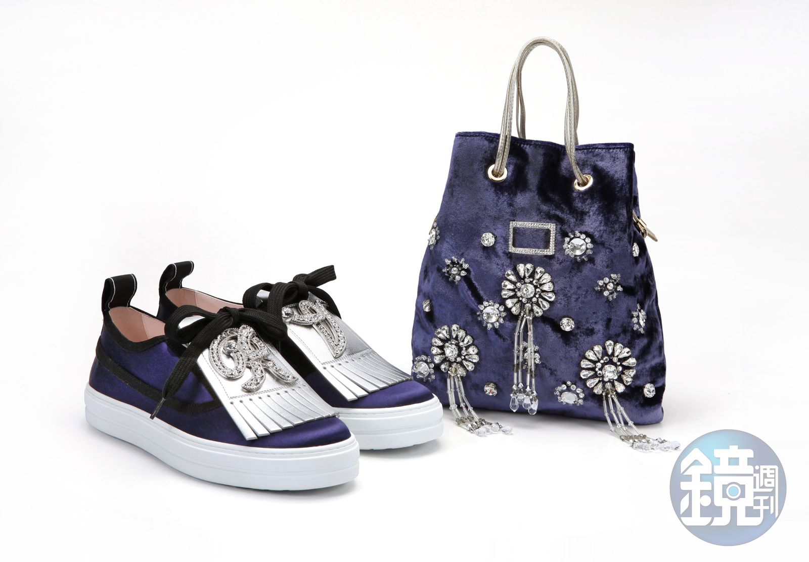 Call Me Vivier Jewel台灣限定版藍色緞面流蘇休閒鞋NT46,200、Viv Pocket水晶刺繡手提包NT64,900。(迪生提供)發布時間:2020.09.24 10:45 臺北時間