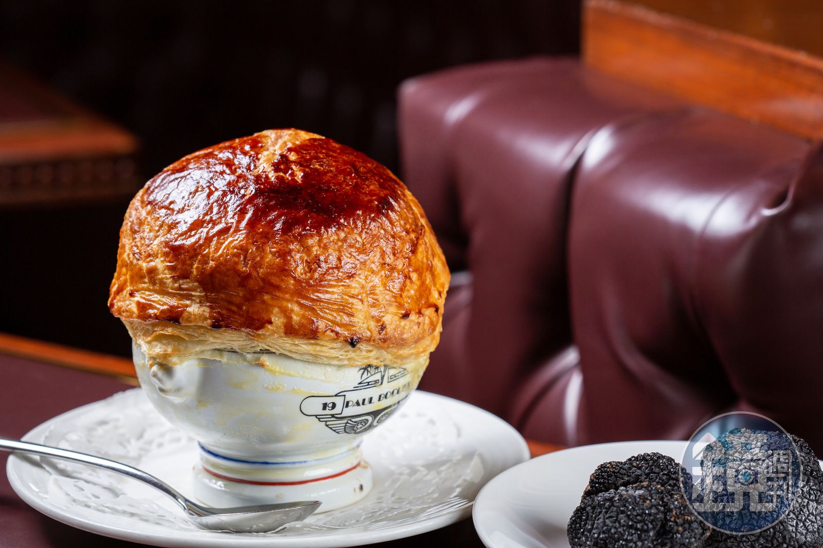 1998年,Paul Bocuse的弟子在至台北亞都客座時,曾經重現了這碗經典湯品,特別訂製的湯碗不但寫上巴黎廳,也印上Paul Bocuse的名字。事隔多年,主廚廖偉立再次端出湯碗,光是試酥皮的配方就花了一個月。「酥皮的厚薄度、湯要裝幾公克、烤的溫度設定多少才會酥皮夠酥,而湯裡的鴨肝也不會過熟。」都是計算題。膨成球狀的紅褐色酥皮,建議先單吃,喝一口加入鴨肝丁、油封鴨腿丁、法國黑松露片的牛澄清湯,湯裡充滿蕈菇豐厚的香氣,最後再將酥皮浸入湯中一起享用。吸飽湯汁菁華的酥皮簡直像是正餐,有顧客特地中午來吃,點這碗就心滿意足。