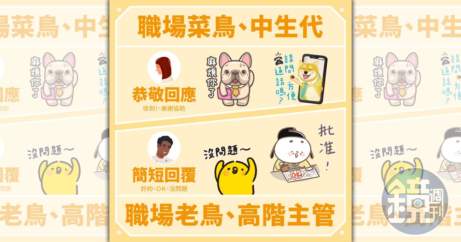 職場使用貼圖要如何有禮貌得人緣?統計發現,職場菜鳥使用貼圖類型多為恭敬回應,或帶有心情抒發展現同事間的關懷,例如禮貌地「等您回覆」、或是「麻煩你了」這類體貼用語。職場老鳥或主管則偏好簡短回覆內容,貼圖文字喜歡精確明瞭,例如:收到了、沒問題,溝通精準到位。最常購買職場風格貼圖的則是20歲女性。