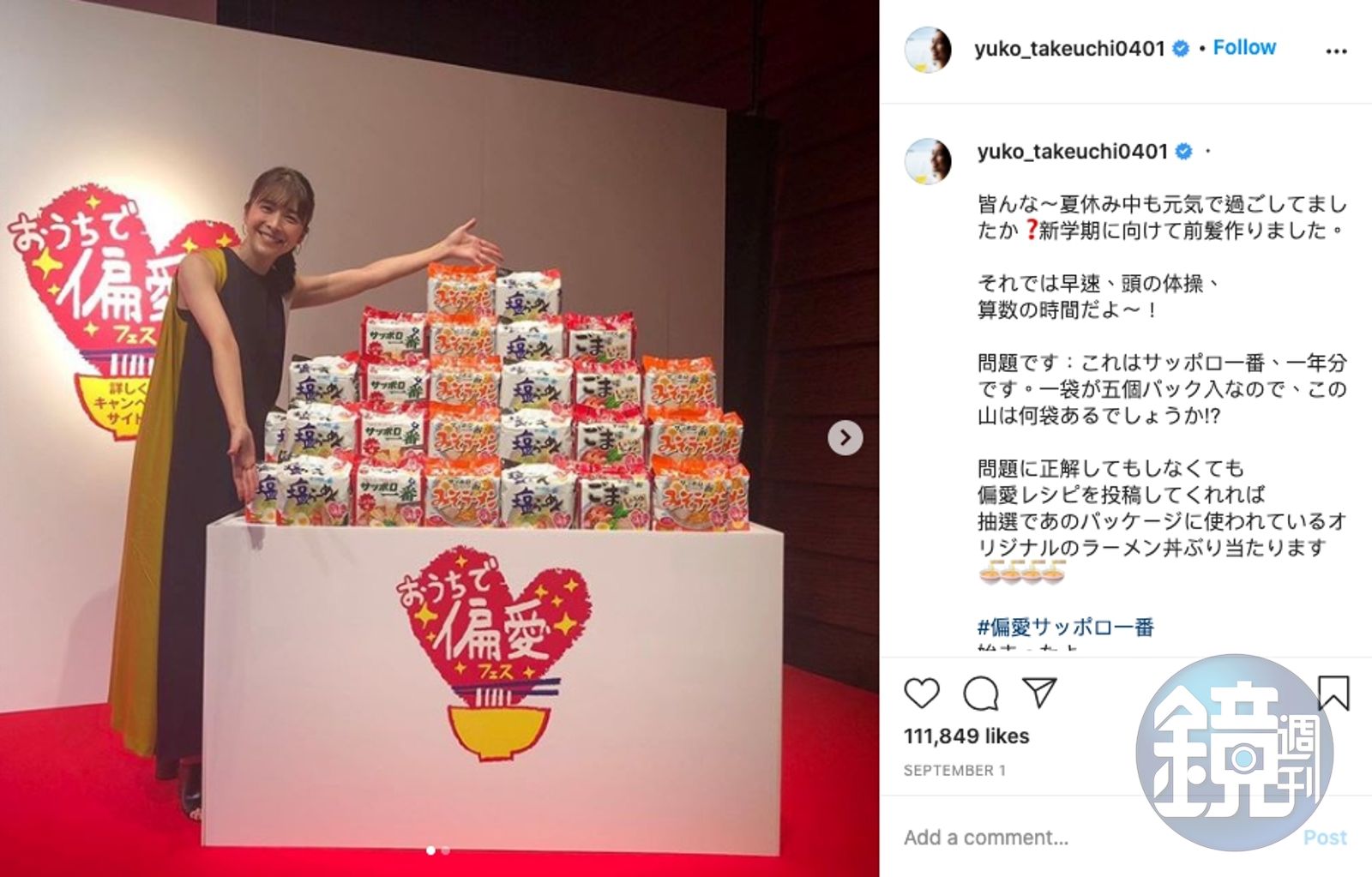 竹內結子9月1日才剛po出代言泡麵的活動照片,看起來已經恢復到產前的最佳狀態,還提到「大家暑假期間是否度過了幸福的時光?」(翻攝自竹內結子IG)發布時間:2020.09.27 10:55 臺北時間