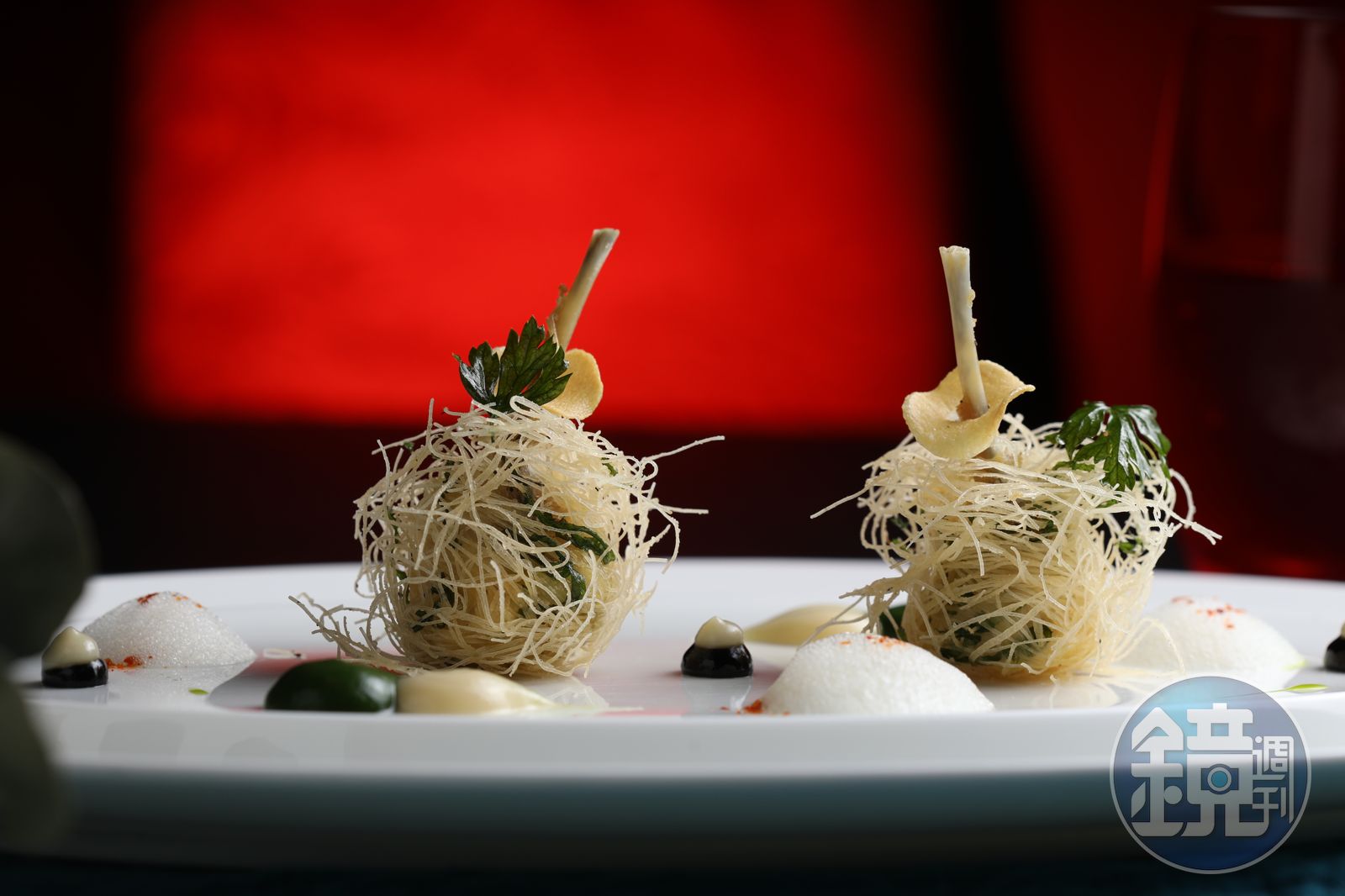 曾經在台灣文華東方酒店擔任2年的主廚,再次回到台灣,Florence認為市場裡的食材更加多元豐富,「舉凡豬、雞、蔬果、食用花、香草植物、香草莢及可可等,我都能直接探訪在地農場,看他們如何養殖、栽培這些食材。」「酥炸田雞腿佐蒜泥及荷蘭芹醬」上桌,這是侯布雄餐廳的招牌菜,源自她的家鄉勃根地,她選用口感比法國更好的本地虎皮蛙,以阿拉伯米線包裹後酥炸,搭配黑蒜美乃滋、蒜泥醬、蒜片,把醬汁收斂成高雅的點綴。