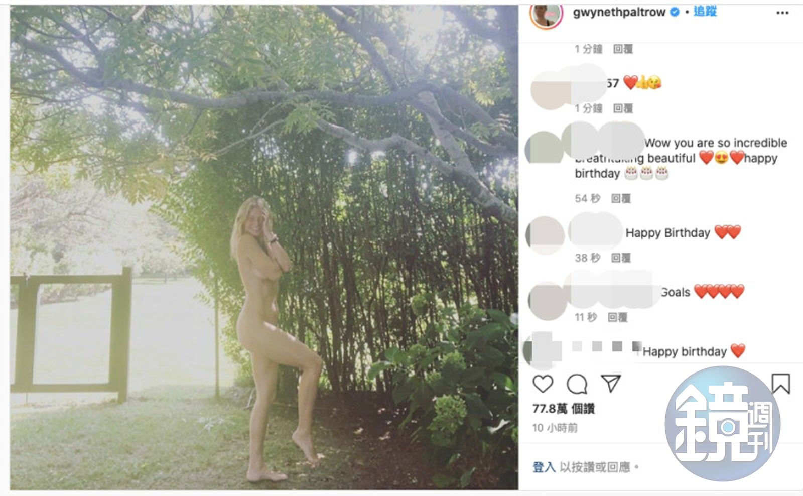 葛妮絲派特洛決定用當初來到人間的方式,赤裸裸的啥也沒穿,歡慶她的生日。在這張裸照底下她寫著:「在我生日這天,回到我誕生的樣子,感謝各位的祝福,還有Goop全新的身體滋潤產品讓我還有本錢裸露。」Goop就是她個人創辦的網路品牌,專門銷售各種身心靈相關的產品,所以搞了半天原來是葉佩雯(業配文)。