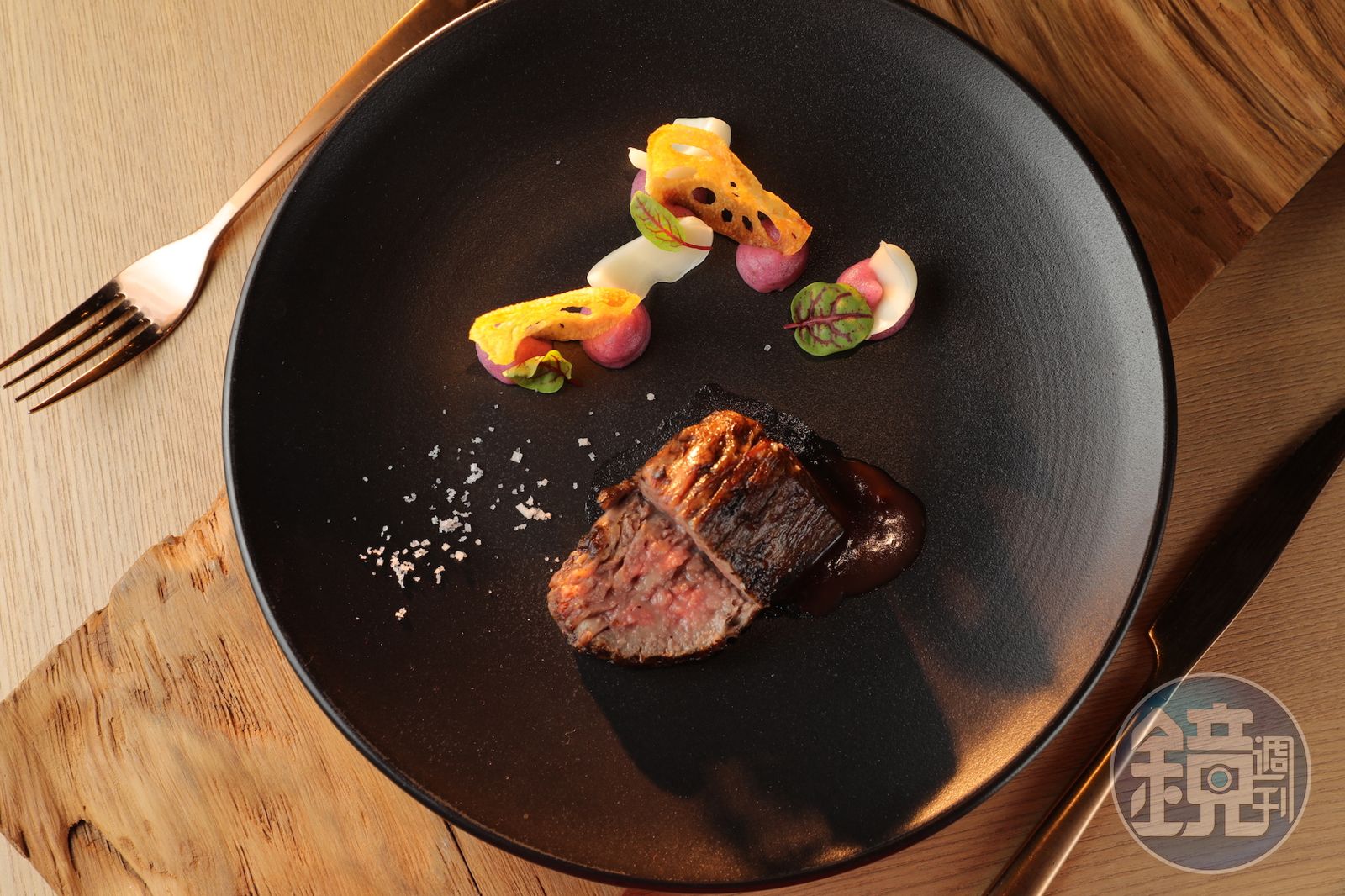 「窯爐的好處是可以低溫慢烤製造如舒肥般軟嫩的效果,又能在最後以直火烤上香氣讓表面焦脆封存肉汁。」洪毅軒說,他串起厚切的澳洲和牛舌放進爐中,慢烤1小時的牛舌微透粉嫩的色澤,口感Q脆。店裡非內臟類的牛肉皆使用鹿兒島和牛,主菜使用A5等級的菲力,以牛油與紅酒做醬汁,搭配發酵7天的百合根與酥炸藕片,豐腴中有酸香酥脆。