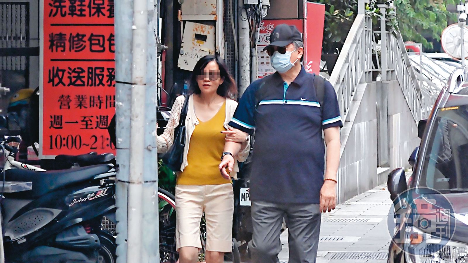 9月16日12:17,趙怡(左)與美魔女(右)在住所密會後出門,2人在口罩及墨鏡掩護下,公然在大街十指交扣。本刊調查,趙怡與美魔女通常都在復興南路一帶約會,且他大多時間都會帶上墨鏡及口罩,相較之下美魔女則不一定。而2人約會的區域,距離趙家約莫只要10多分鐘的車程,因此,趙通常不會晚歸,他緊守灰姑娘法則,多數在凌晨12點前回家。