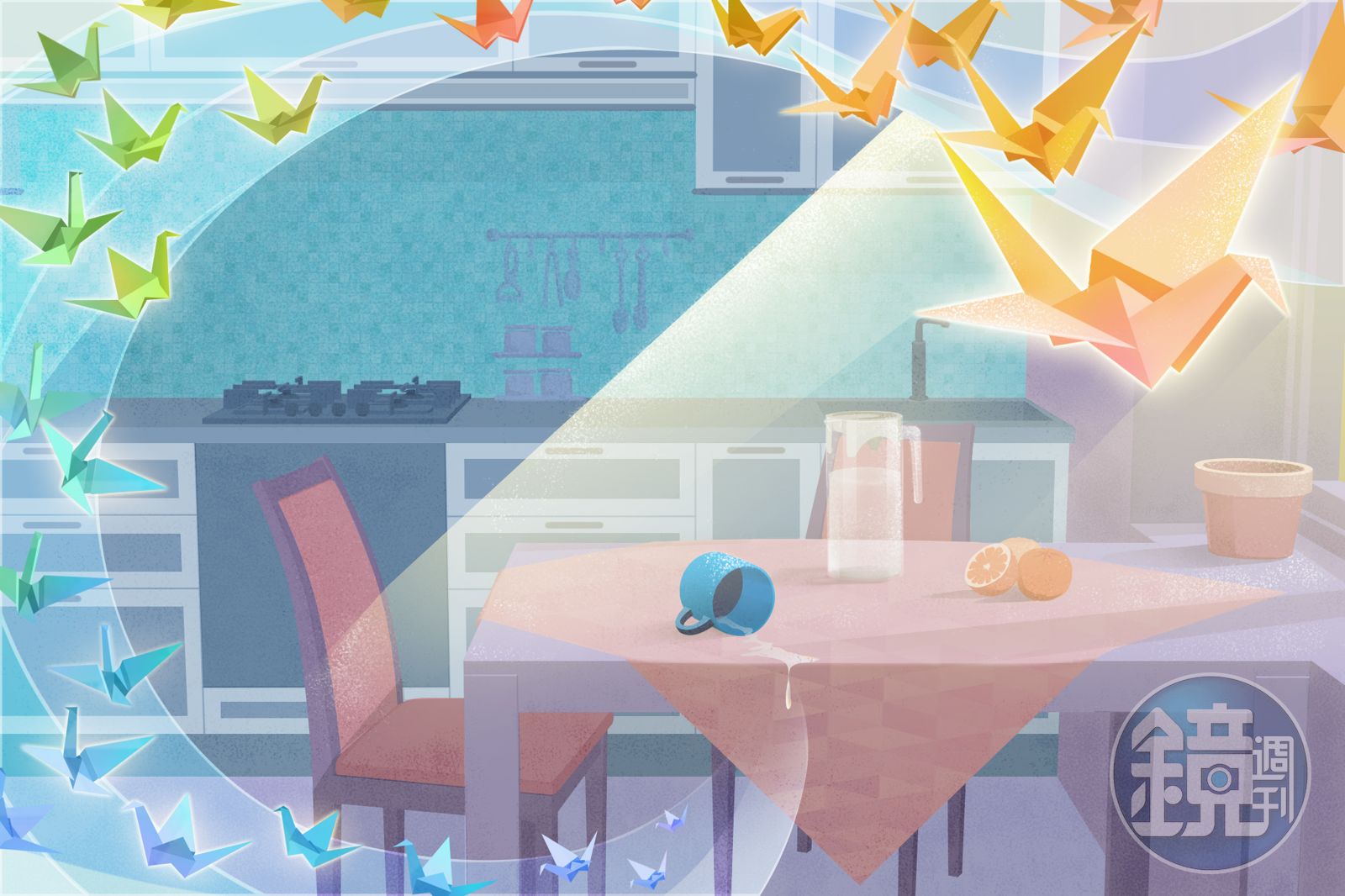 橙汁的陽光斜射,籠罩我鍾愛的舊餐桌