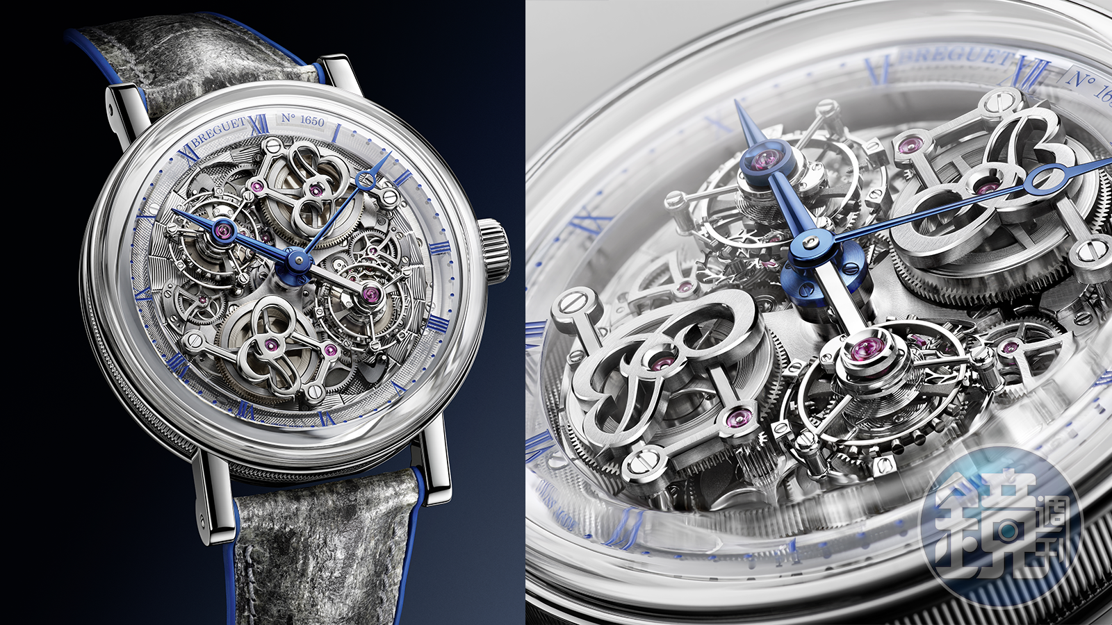今年推出的這款Classique Double Tourbillon 5345 "Quai de l'Horloge" 鏤空雙陀飛輪,是5347的變化型,最大的不同在於面盤以鏤空呈現,兩個發條盒連帶跟著外露、錶徑也比初代大了2mm。2006年的5347雙陀飛輪,是寶璣第一次跳脫傳統單一陀飛輪模式做的創新,所以自然會把能代表寶璣的元素都用在上面,因此面盤用了招牌的機刻雕花(Guilloché),搭配寶璣指針、還有錶側的錢幣紋,細看就會發現雖然推出了雙陀飛輪這個創新設計,但寶璣的基本脈絡還是沒有偏離的。機刻雕花面盤搭的又是玫瑰金,讓5347看起來比較古典,而這次的5345寶璣用了鏤空面盤設計,而且還搭配Box鏡面,凸起的鏡面拉出了空間高度,因此從側面可以更清楚看到陀飛輪作動,寶璣藍鋼針配上藍色時標、以及同色調橡膠錶帶細節,整體看上去比起第一代真的年輕化了不少。