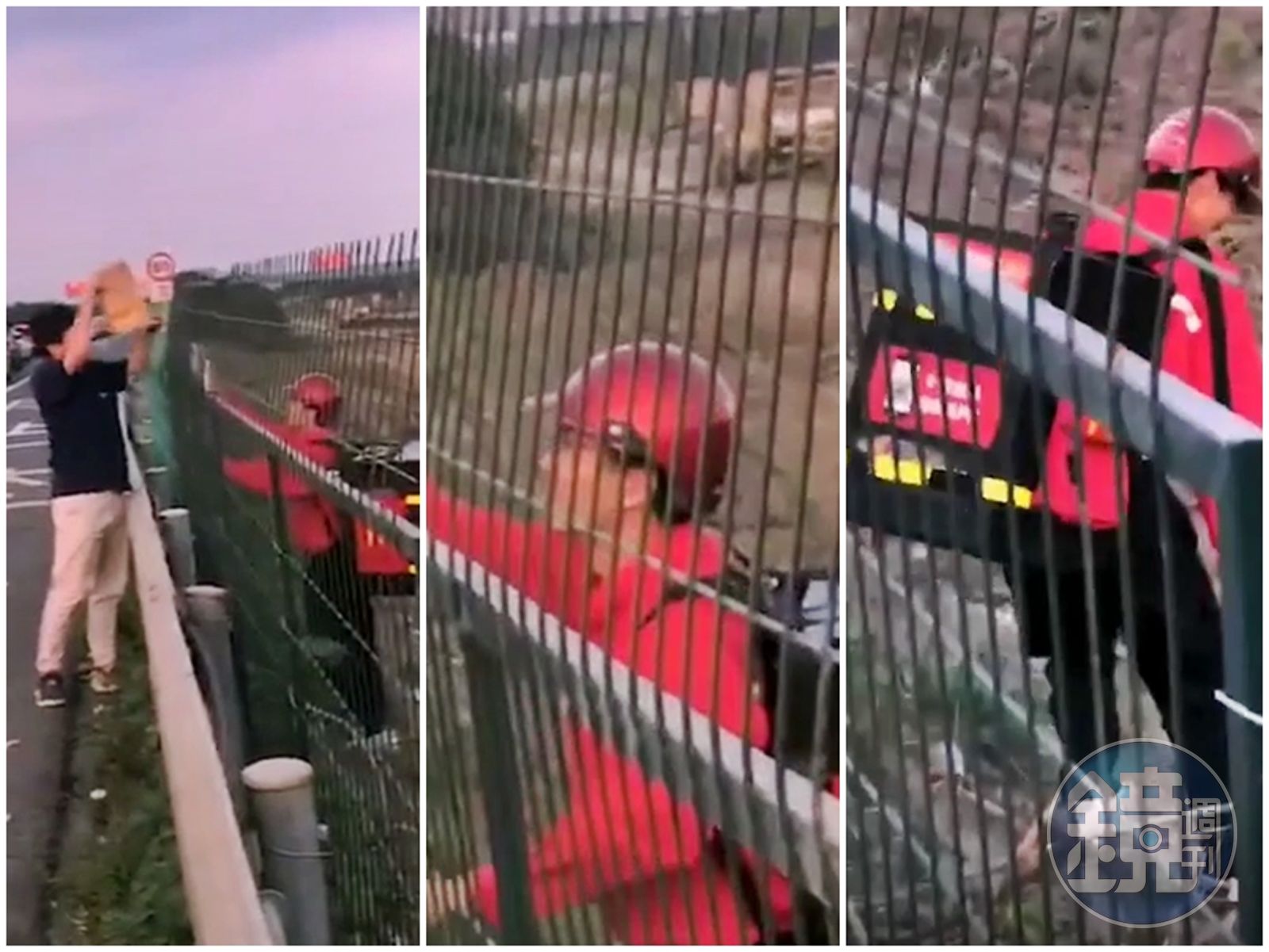 鏡頭一轉,只見公路柵欄外1名穿紅衣背紅袋的麥當勞外送員,將餐點拿給公路上的男子,然後揮手離去。目睹不可能的送餐任務,拍攝影片網友忍不住傻笑。