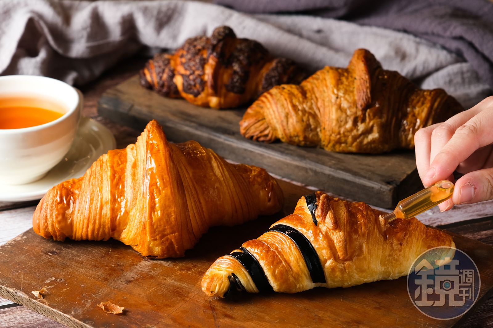 「蜜蜂可頌」(右前,65元/個,新光三越A11櫃位限定)可把蜂蜜擠在肚子裡,或淋在表面,蜜香濃稠。「原味可頌」(左前,50元/個)口感酥脆,奶香細緻。「台灣茶可頌」(右後,55元/個)茶香淡雅。「脆皮可可頌」(左後,60元/個)有濃郁巧克力醬。發布時間:2020.11.03 16:45 臺北時間