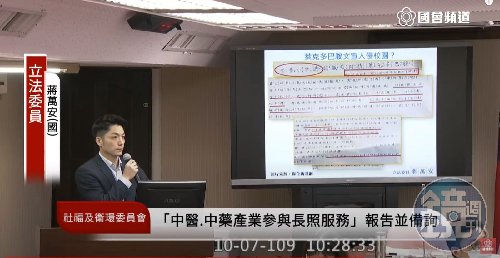 國民黨立委蔣萬安今在立院社會福利及衛生環境委員會,質詢衛福部次長石崇良以及教育部國教署長彭富源,指出疑似有萊克多巴胺的文宣進入國小校園,標題寫道〈營養小常識 認識瘦肉精(萊克多巴胺)〉,內容描述瘦肉精可提高瘦肉比例,減少飼料成本、增加利潤等優點,並註明「資料來源出處:衛生福利部食品藥物管理署」。