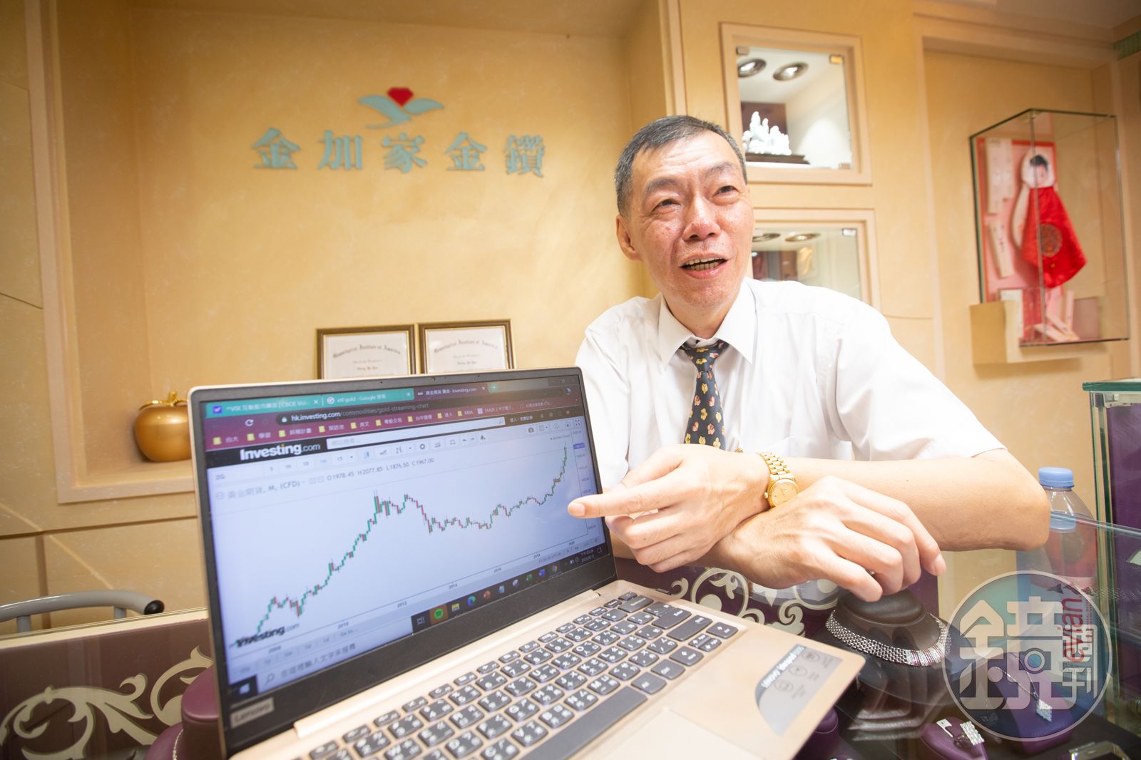 「去年第二季,我就非常看好2020年黃金價格會有起色,主要是金價漲跌有週期性,10年為一大波段,2019年已經來到十年整理期的尾聲。本來預估今年每盎司可以到1800美元以上,沒想到遇新冠疫情,金價急速飆漲,超過預期。」摸了黃金45年的金加家珠寶董事長石文信驚嘆地說。
