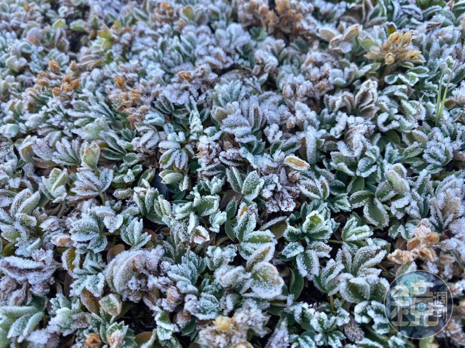 中央氣象局局長鄭明典今(8日)在臉書分享玉山北峰結霜美照,只見植被上一層薄霜,宛如撒上糖粉的夢幻世界,讓網友忍不住讚嘆「好美喔」。