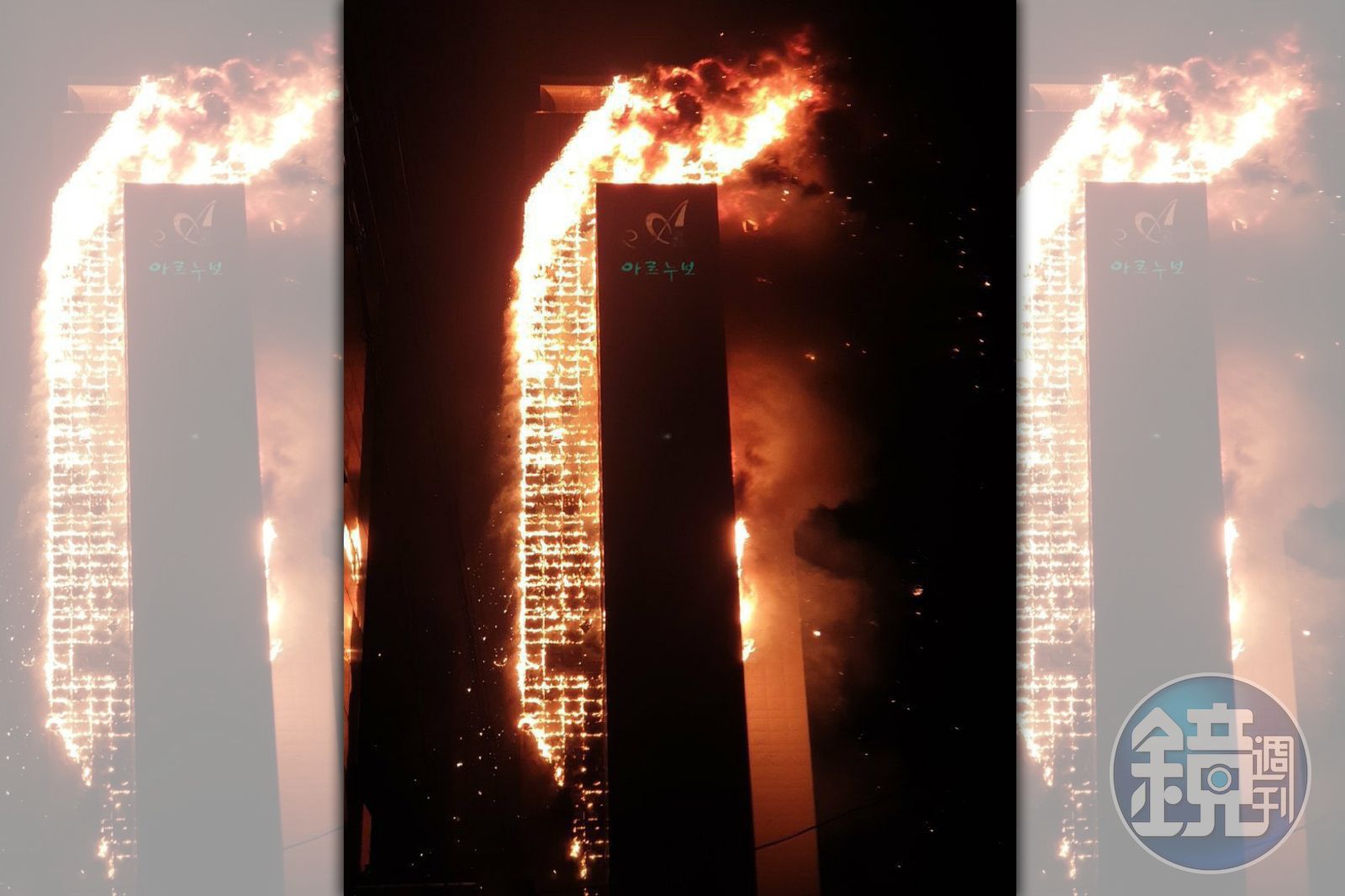 南韓33層住宅昨天深夜大火,火舌竄整棟樓,怵目驚心。(翻攝自推特)發布時間:2020.10.09 08:50 臺北時間