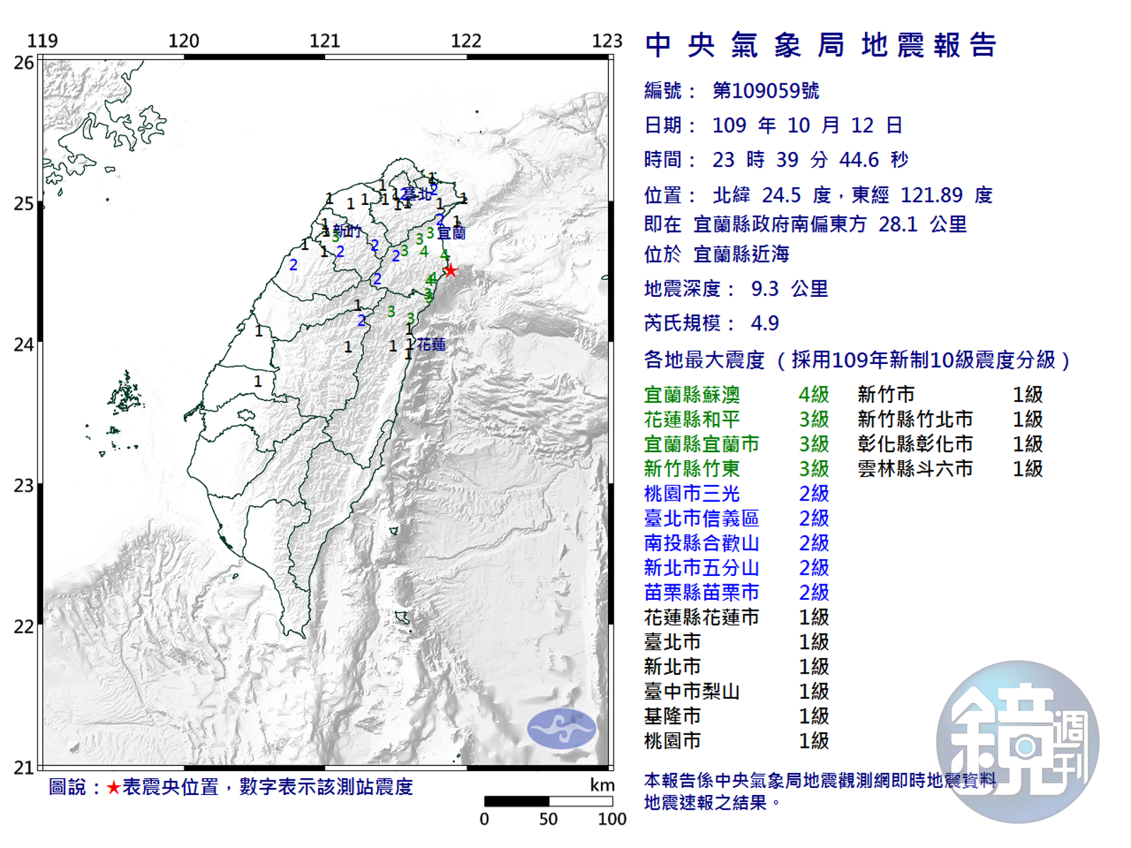 2020.10.13 00:12 臺北時間深夜地牛翻身!23:39宜蘭縣近海規模4.9地震 最大震度4級生活12日23時39分,宜蘭縣近海,宜蘭縣政府南偏東方28.1公里,發生芮氏規模4.9地震。(翻攝自氣象局官網)發布時間:2020.10.13 00:12 臺北時間更新時間:2023.09.12 20:36 臺北時間文 謝文哲已複製連結贊助本文加入訂閱會員宜蘭中央氣象局地震深夜地牛翻身!12日23時39分,在宜蘭縣近海,宜蘭縣政府南偏東方28.1公里,發生芮氏規模4.9地震,地震深度僅9.3公里,屬於極淺層地震。根據中央氣象局地震報告,最大震度落在宜蘭縣蘇澳,達4級,花蓮、新竹3級,桃園、台北、南投、新北、苗栗2級,台中、基隆、彰化、雲林1級有感。更新時間|2023.09.12 20:36 臺北時間延伸閱讀「老大犯錯、小弟出面呼攏」 全教總:抵制康軒到李萬吉出面道歉康軒「吹哨者」風波調解成功 雙方握手言和東洋取得德國武肺疫苗代理權 最快明年初可供500萬人施打【千坪非法夜市】總站夜市違法偷跑還「私接電源」 台電:涉及民眾安全支持鏡週刊小心意大意義小額贊助鏡週刊!贊助本文每期 $35 元動態話題報導無限閱讀解鎖新鮮事加入訂閱會員鏡週刊加入追蹤訂閱下載鏡週刊加入追蹤訂閱下載更多內容,歡迎 鏡週刊紙本雜誌、鏡週刊數位訂閱、了解內容授權資訊。獨家深度分析報導線上閱讀