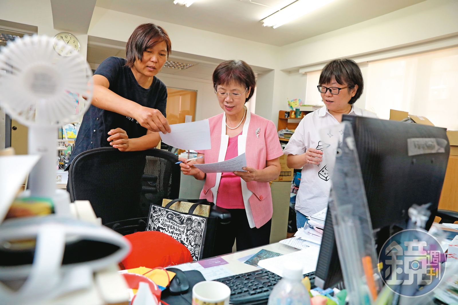 她34歲時意外懷了三女兒,婆婆、媽媽都因年紀大不便再幫忙帶小孩,她本來準備拿掉,先生卻說:「我來帶啊!」小女兒半夜只要哼一聲,先生就手忙腳亂起來泡奶。她淡淡說:「我本來想起來幫忙,狠下心來裝睡啊!所以育兒不是天生母職,可以改。」就像法律不完美,但還可以改,「立院也不是到這屆就結束,不然以後的人要幹嘛?婦運走了40年還在努力,《民法》到現在都還沒修完呢!」