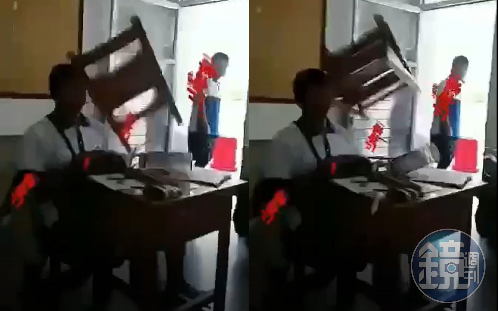 另段影片則顯示,同名男同學原本想遠離衝突現場,走到教室走廊外,結果被一名身材壯碩的同學硬是要拽回教室內,男同學抱著教室門口不從,就被同學以右勾拳暴打頭部,而教室內多名同學依然看戲般,還對著鏡頭跳舞,足見班級上對這名男學長期霸凌的互動。