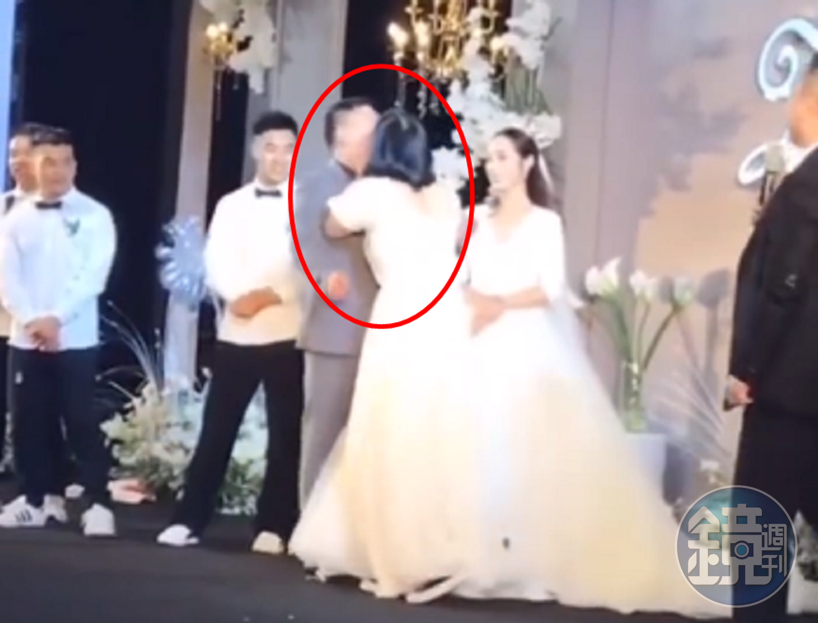 影片中可見,當時婚宴正進行到一半,新郎和新娘站在舞台上接受大家祝福,伴郎和伴娘群同時也站在台上,只見一名留短髮的伴娘先是緊緊擁抱新娘,沒想到接下來她卻衝到新郎面前,突然用雙手捧起新郎的臉強吻下去,親完之後便瀟灑走人,場面相當尷尬。