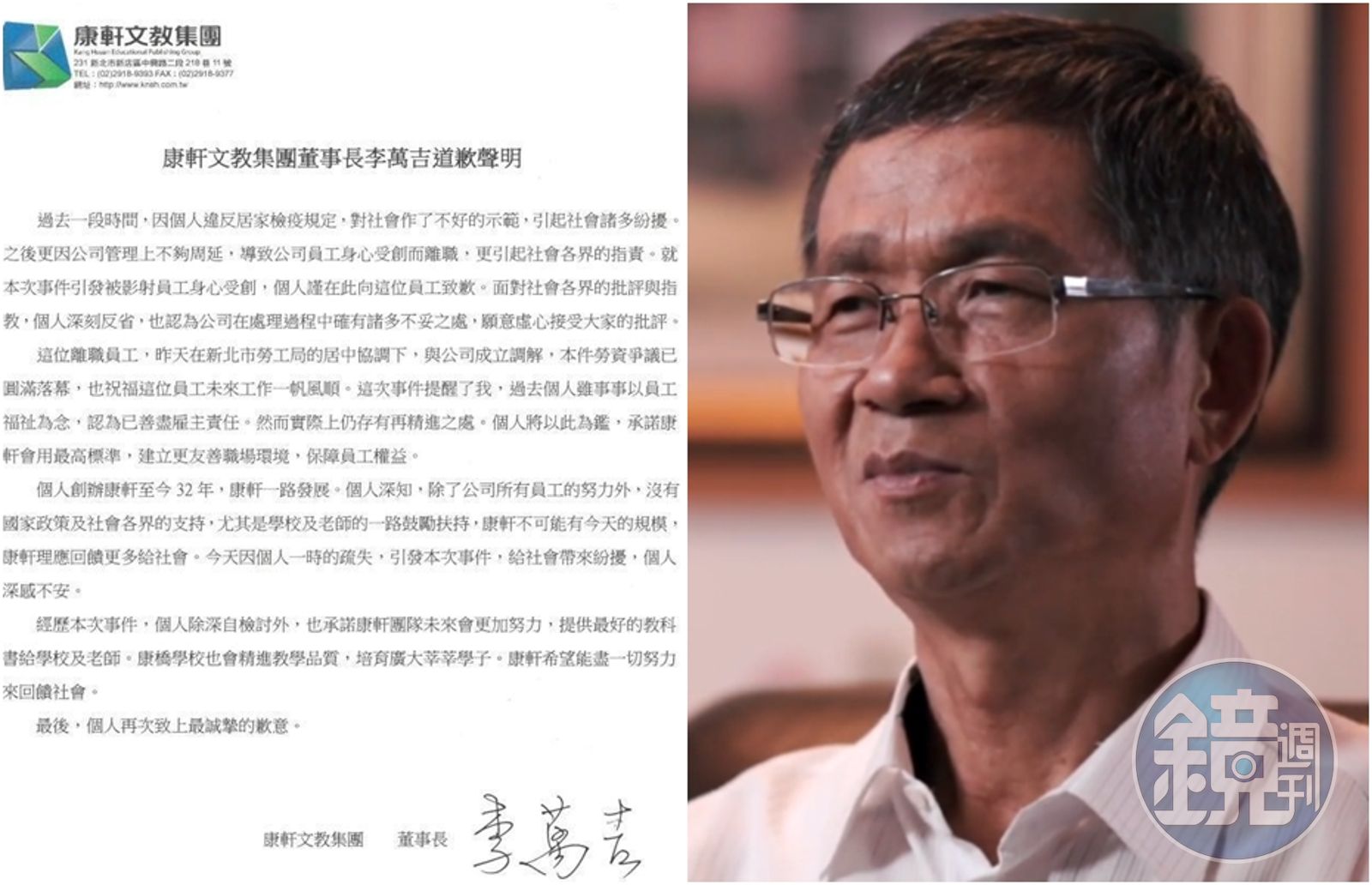 李萬吉在道歉聲明中表示,「面對社會各界的批評與指教,個人深刻反省,也認為公司在處理過程中確有諸多不妥之處,願意虛心接受大家的批評。」他也承諾康軒團隊未來會更加努力,培育廣大莘莘學子,希望能盡一切努力來回饋社會。