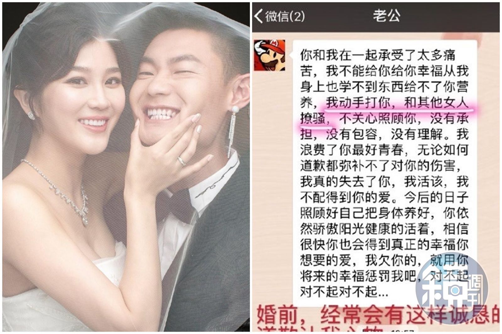 張莫涵透露,從交往到結婚2年來,共報警3次、驗傷1次,更指控老公在外有小三,2人多次在深夜約會,雙方甚至還拍了性愛影片,不過讓人吃驚的是,警方曾問張培萌為何對妻子下手,他竟回:「運動員都這樣,雄性激素高。」