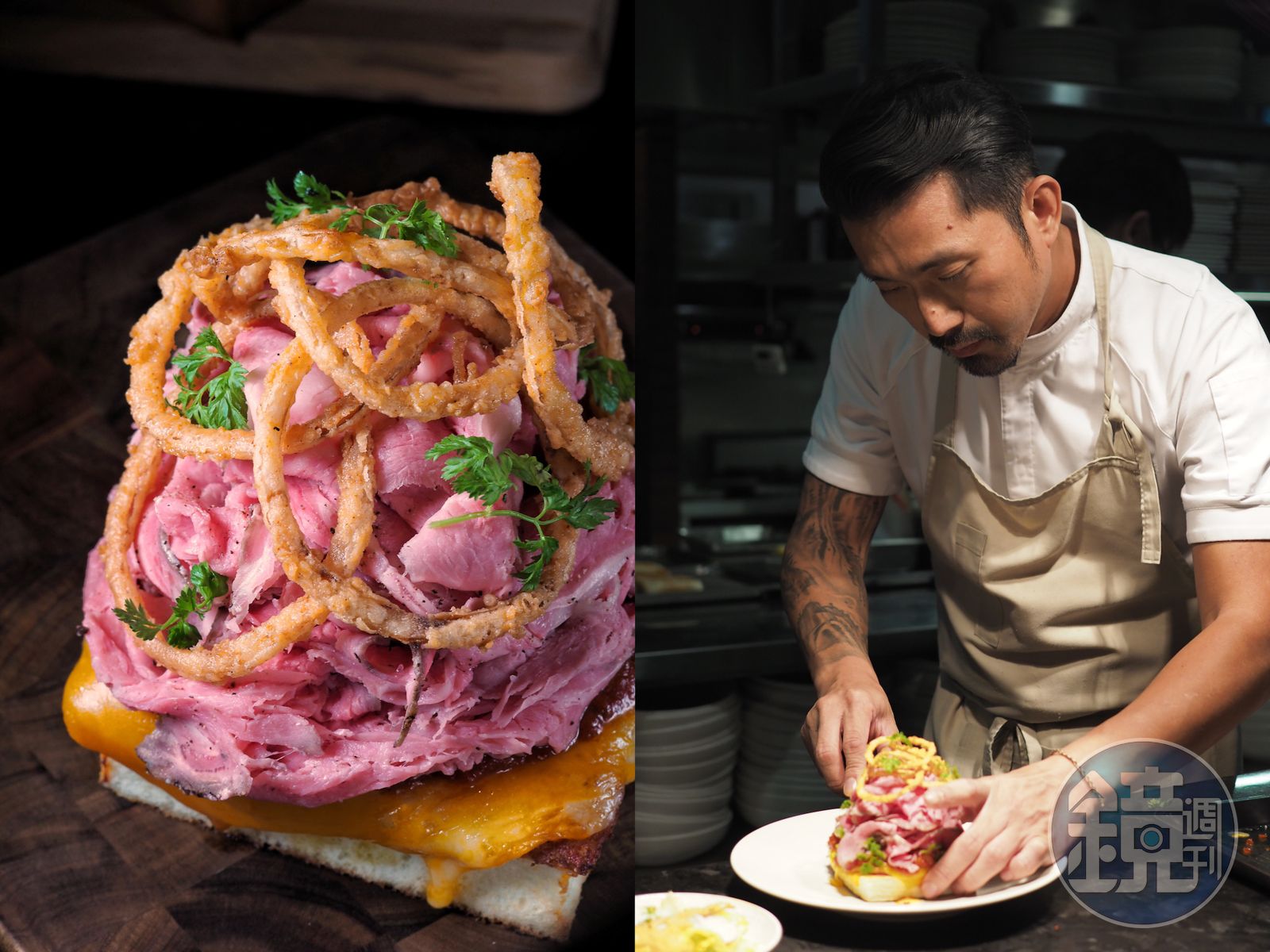 「現在很多三明治裡會夾和牛等高價食材,但是這樣一來價格也會很驚人。」為了符合早午餐親切的調性,用的是美國Prime肋眼薄切烤牛肉,餘火低溫燻烤三小時,三分熟的誘人粉紅肉質鮮甜多汁,搭配的卻是口味濃重的辣味煙燻番茄醬,以煙燻番茄和墨西哥燻辣椒製成,適合喜愛重口味的人。