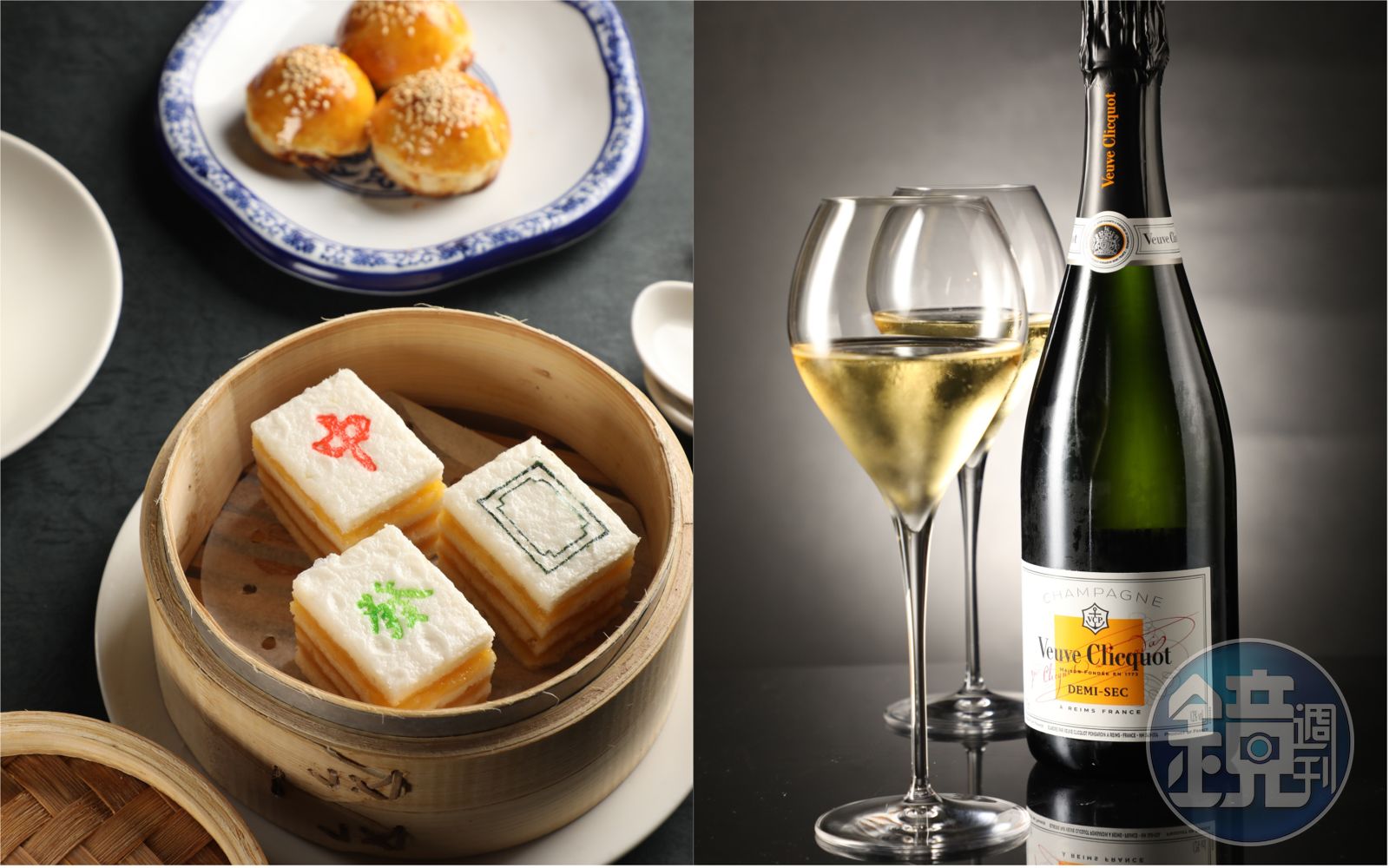於是Charles用香檳巧搭港點,反而創造亮點,他用「嚇一跳」形容與使用「放血法」釀製的「Vincent Charlot “L’Ecorche de la Genette”, Rose de Saignee, Extra Brut, 2012」的初相識。「一開就聞到野莓香,怎麼有這麼香的粉紅香檳啊?醒半小時再喝,更濃郁,如花朵綻放開來。」杯子裡花開了,飲一口花香,細小氣泡融化「金牌叉燒酥」的細緻酥皮,留下野莓香;帶濃縮果醬感、甜而不膩的香檳「Veuve Clicquot, Demi-Sec, NV」,為「三元千層糕」增添麵包烘烤香氣。
