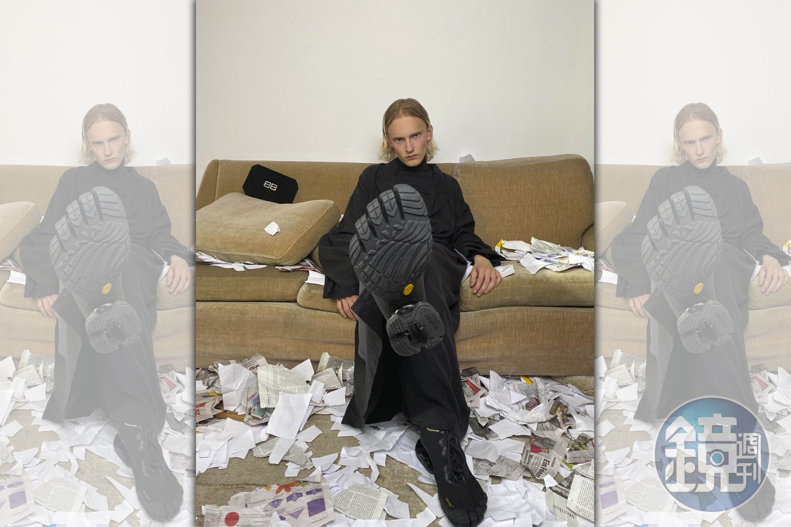 BALENCIAGA Toe採用創新的懸浮式鞋跟。(BALENCIAGA提供)BALENCIAGA Toe五趾鞋是品牌與義大利知名制鞋商Vibram合作所推出的鞋款,Vibram是全球知名的橡膠鞋底製造商,最出名的產品當屬專利五趾鞋(FiveFingers)系列,該系列的鞋底柔然,像手套一樣貼合人體的腳掌,並將每個腳趾分開,在行走或攀爬運動時為肌肉提供更好的抓地觸感。