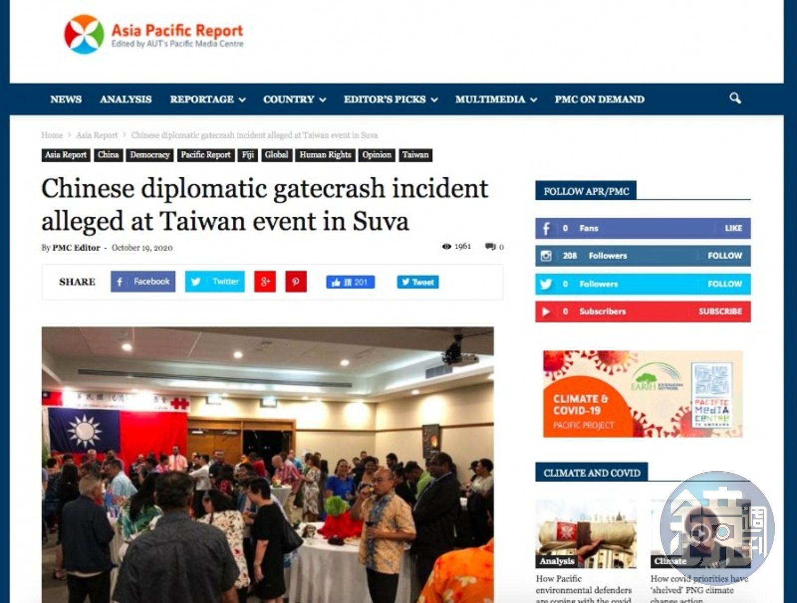 根據《亞太報告》報導指出,我國駐斐濟代表處10月8日晚間於太平洋大酒店舉辦國慶晚宴,會中突然有2名中國外交人員闖入,並且拍照記錄現場與會的外交使團、國際組織、非政府組織和斐濟華人社區成員。