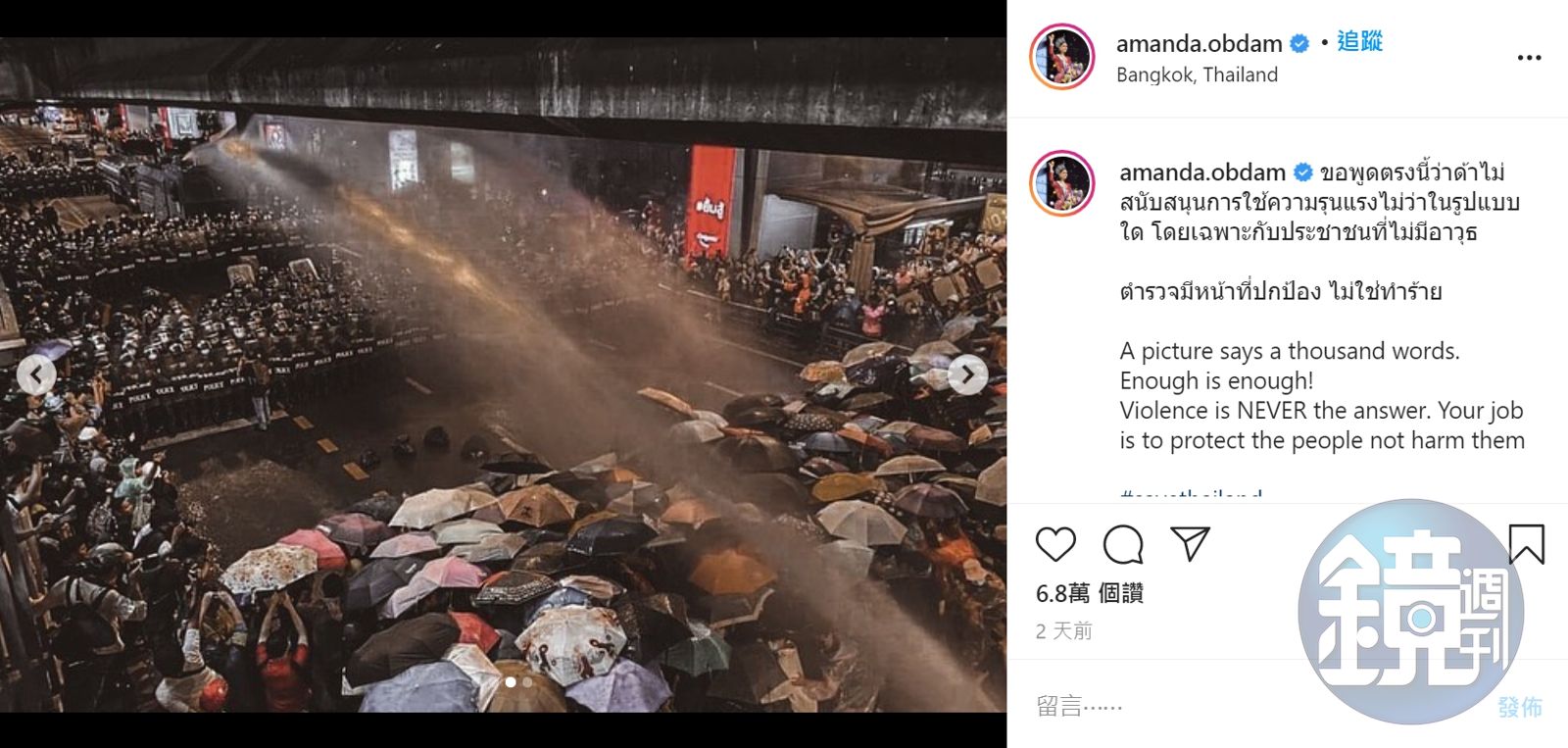 奪下泰國環球小姐(Miss Universe Thailand)后冠的亞曼達(Amanda Obdam)也在自己的Instagram發布學運示威的照片,並寫下「一張照片勝過千言萬語,真的夠了!暴力『從來不是』解答,你們的工作是要保護人民,而不是傷害他們。#拯救泰國」。