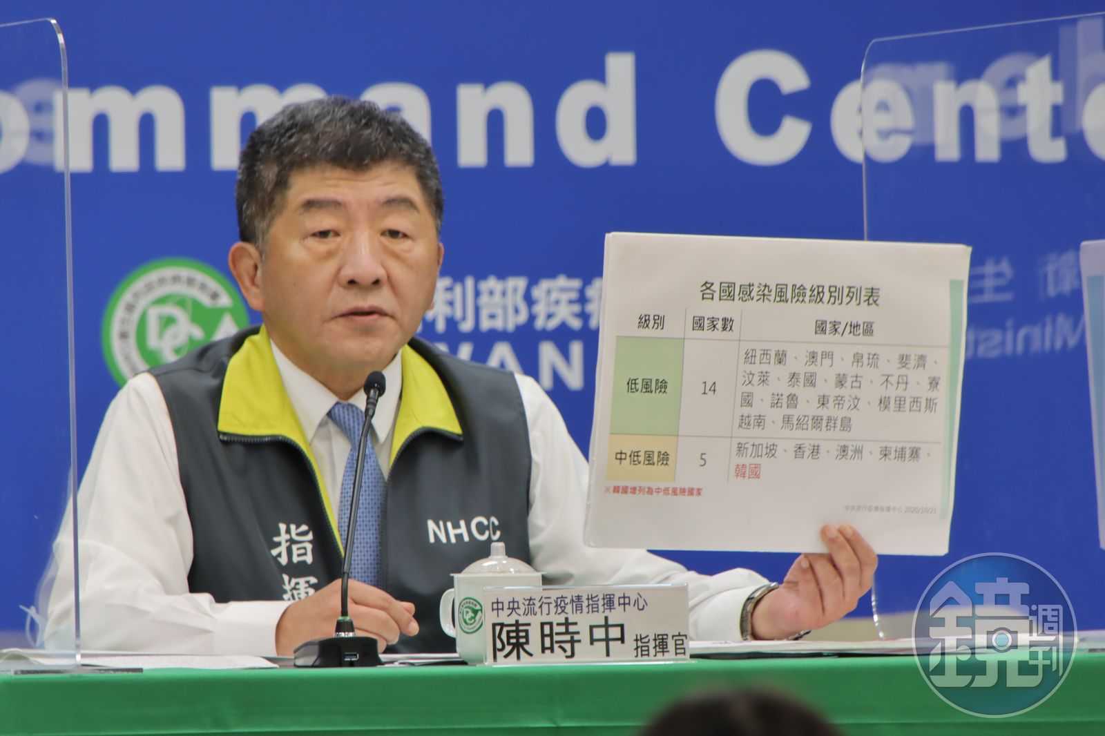 由於南韓近期疫情趨緩,已連續4週達中低風險分級標準,指揮官陳時中宣布,將該國與新加坡、香港、澳洲、柬埔寨,列為中低感染風險國家。低感染風險國家部分,目前則有紐西蘭、澳門、帛琉、斐濟、汶萊、泰國、蒙古、不丹、寮國、諾魯、東帝汶、模里西斯、越南、馬紹爾群島。