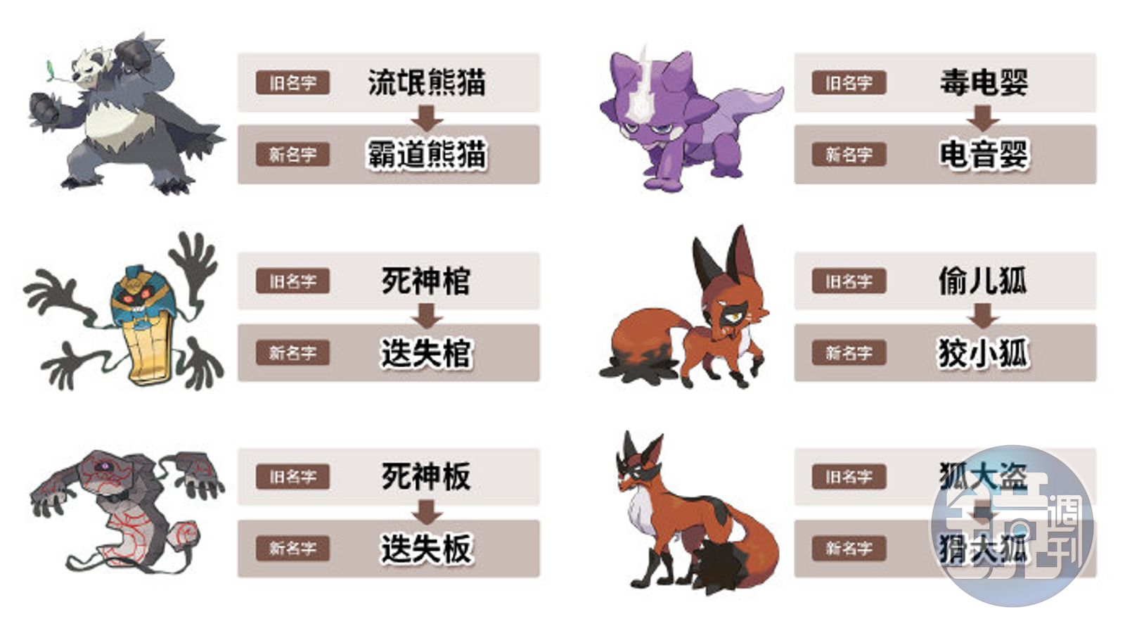 這次簡體中文名稱更改的寶可夢總共6隻,包括「流氓熊貓」變「霸道熊貓」,「毒電嬰」變「電音嬰」,「死神棺」「死神板」分別改為「迭失棺」「迭失板」,「偷兒狐」新名稱是「狡小狐」,「狐大盜」則是「猾大狐」。