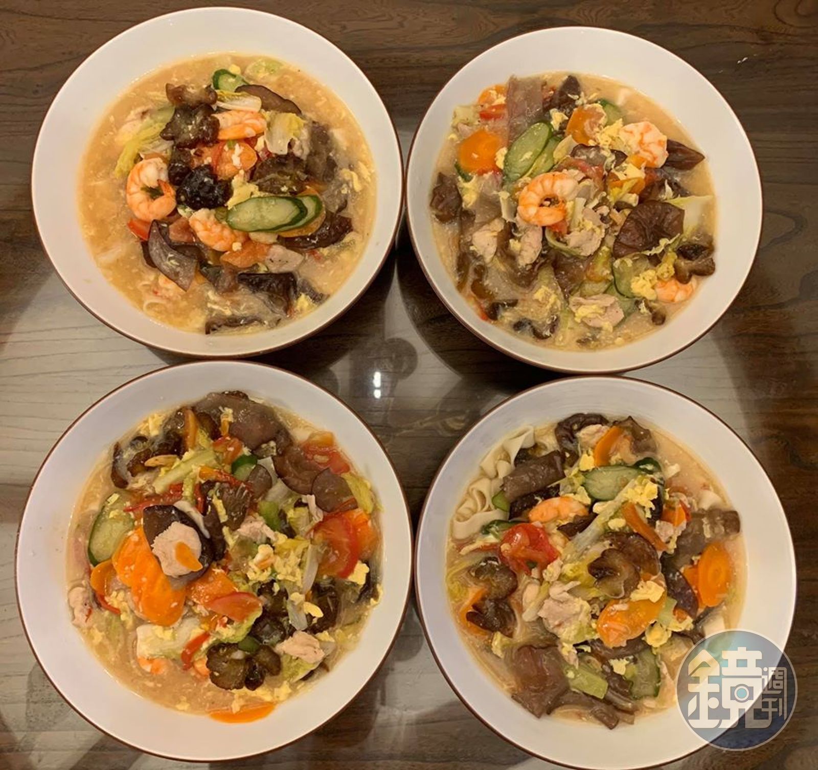 之後,下海參片、蝦仁、雞肉片爆炒,再將所有蔬菜片熗鍋快炒。下熱水,您會聽到喳一聲,香味四溢。水滾,下鹽、白胡椒試味。可,下寬麵。(原來一人份是一球麵,現在6人份可下4球,因為打滷麵主張料多麵少)