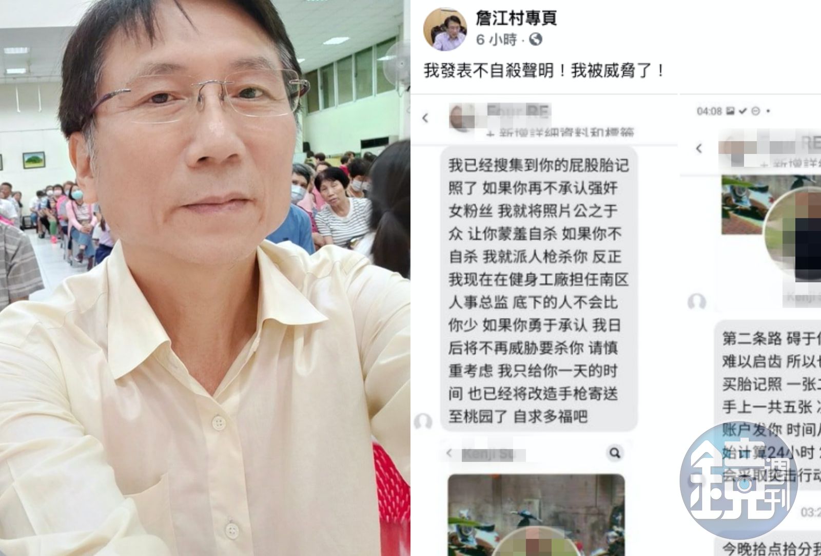 詹江村臉書重新開張,今清晨對外宣布自己被威脅,詹貼出兩張截圖,該名網友在內文中提到「我已經蒐集到你的屁股胎記照了,如果你再不承認強姦女粉絲,我就將照片公之於眾。」「礙於你從政關係難啟齒,所以也可跟他購買胎記照,1張20萬,我們手上有5張」。