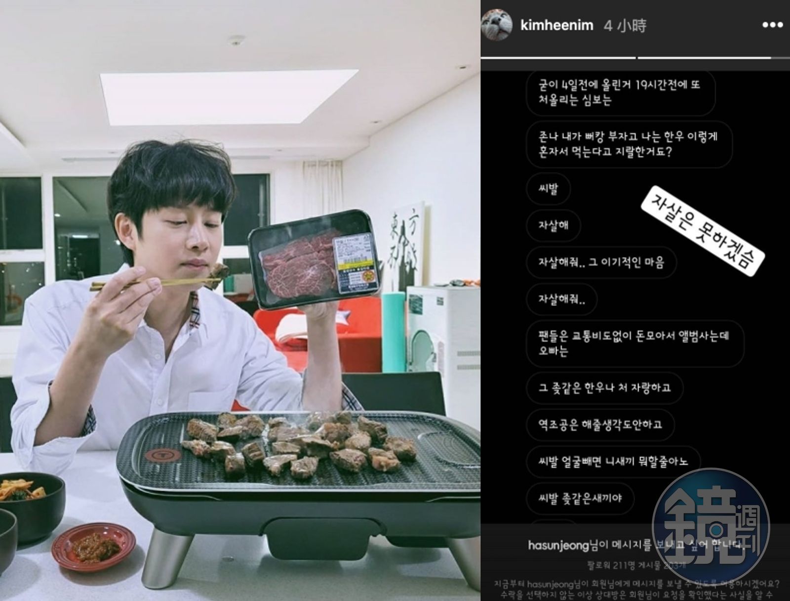 該名酸民的私訊內容,除了批評希澈po烤肉照炫富,還故意說粉絲將交通費省著去買專輯,「歐巴卻吃的那該死的韓牛,也不會幫粉絲做逆應援(指偶像請粉絲的行為)」,後面還嗆「你沒有這張臉還剩什麼?」一共說了三次要希澈去死的文字。讓網友看了都生氣地回應,「這是什麼水準」、「這人有病吧」。