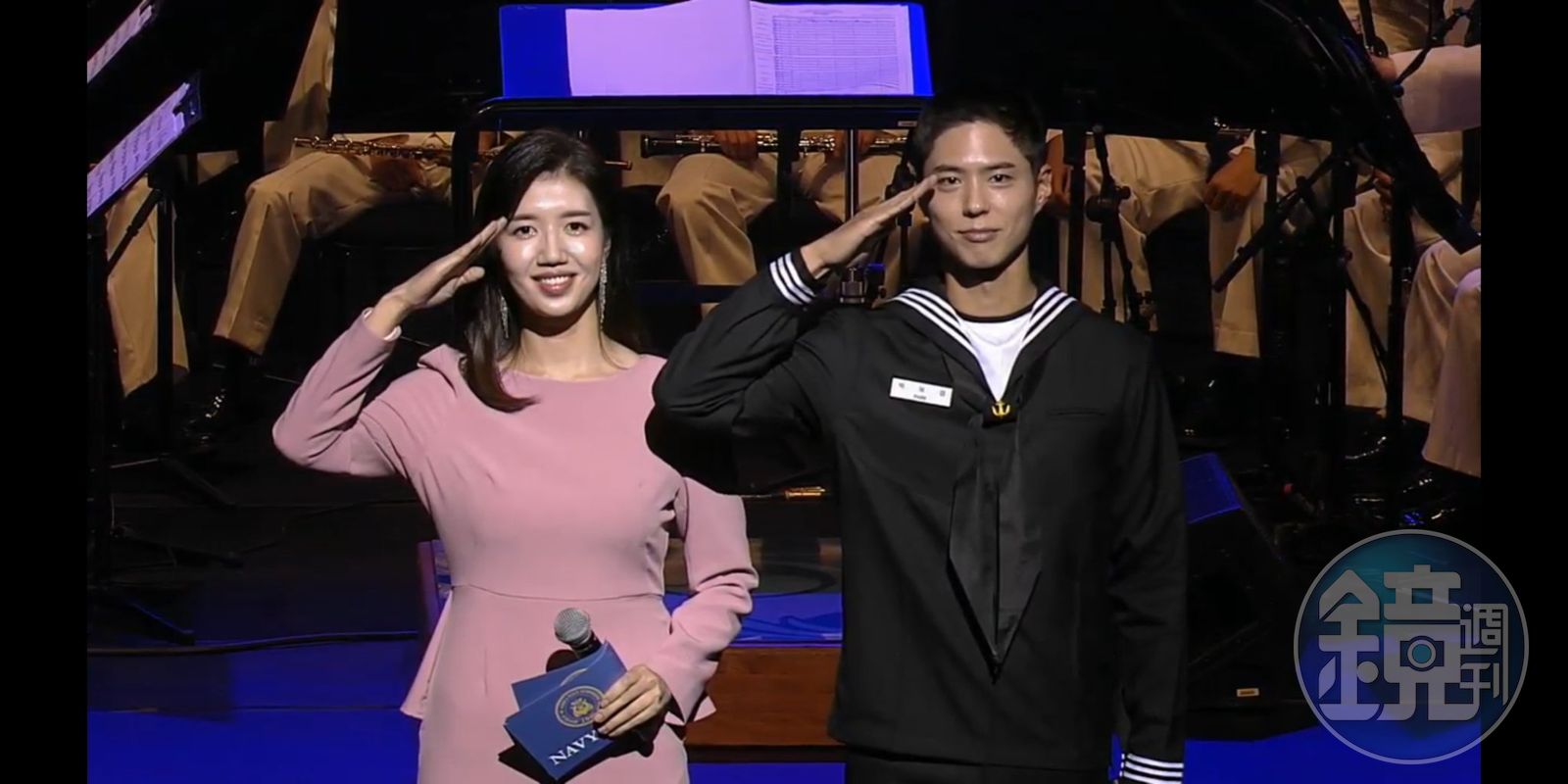 8月入伍服役的朴寶劍,昨天在濟州島舉行的「2020韓國海軍護國音樂會」上擔任了主持人,有著豐富主持經驗的他,穿著藍色海軍制服與另一位女主持人共同負責音樂會的主持工作。朴寶劍說:「希望大家在愉快欣賞完《護國音樂會》之後,還記得收看《青春紀錄》和即將上映的《永生戰》,請大家多多關注與喜愛。」