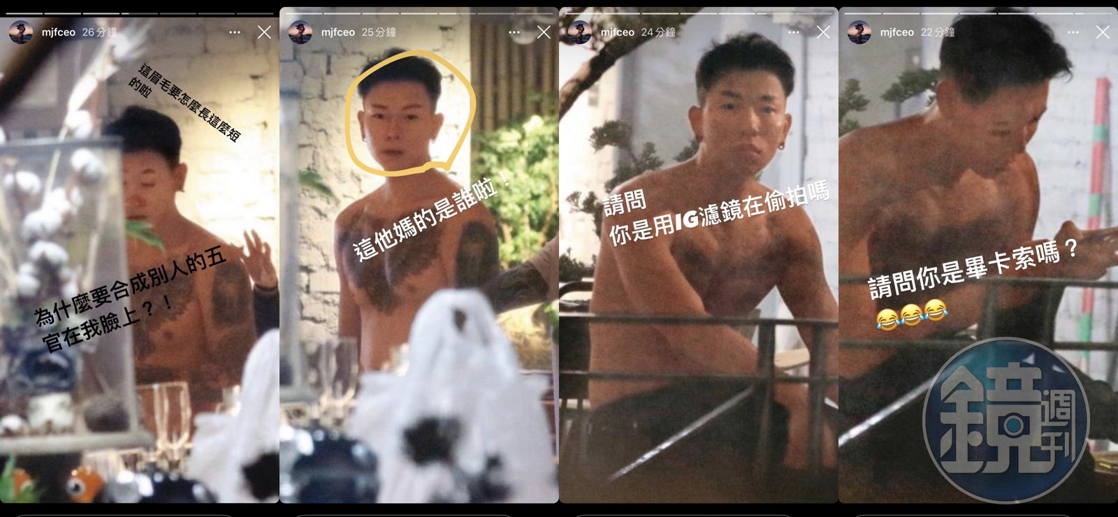 28日本刊刊出瘦子與女友的刺青行程直擊,他除了不滿被跟拍,也對外笑到噴淚,自嘲曝光的照片「這眉毛要怎麼長這麼短的啦」「為什麼要合成別人的五官在我臉上?!」「這他媽的是誰啦!」「請問你是用IG濾鏡在偷拍嗎」「請問你是畢卡索嗎?」