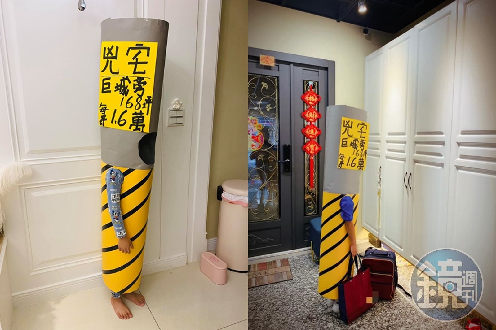 照片中,可見這名媽媽將灰色、黃色的紙拼接在一起,並在底部設計黑黃相間的斜線樣式,跟真正的電線桿幾乎一模一樣,甚至上面的「凶宅」廣告上,還逗趣寫著「168坪,每坪1.6萬」,不但好穿脫也省很大,超酷又前衛的「角色扮演」獲網友力讚,貼文PO出16小時內已累積1.6萬人次按讚、超過1千則留言。