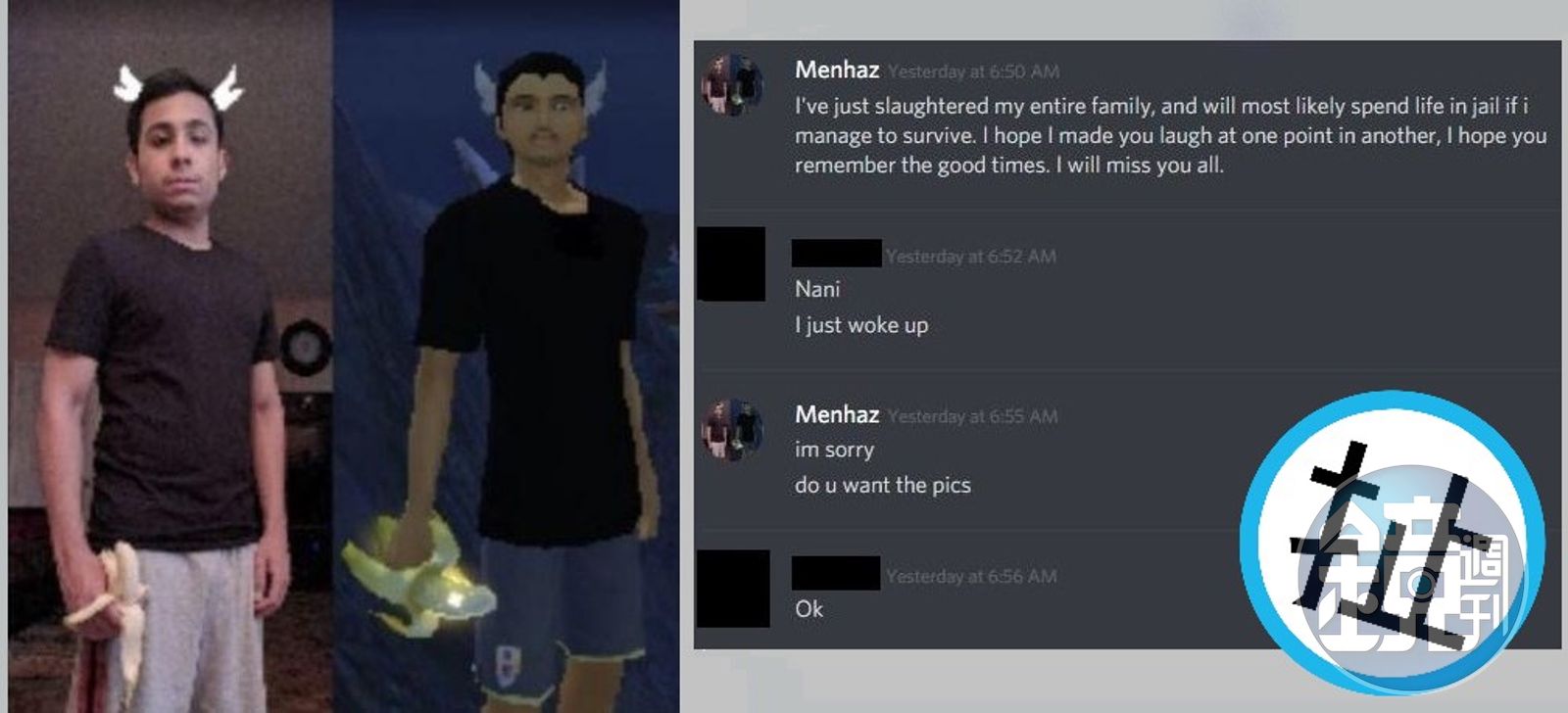 案發後,曼哈茲登入遊戲專用通訊軟體Discord,在某遊戲群組內發送訊息:「我剛剛殺了我全家。」並描述案件過程。起初網友不以為意,隨著曼哈茲丟出越來越多細節和照片,感到毛骨悚然的網友趕忙報警,曼哈茲在為警察開門前,還向群組道別:「警察到了,再見。」