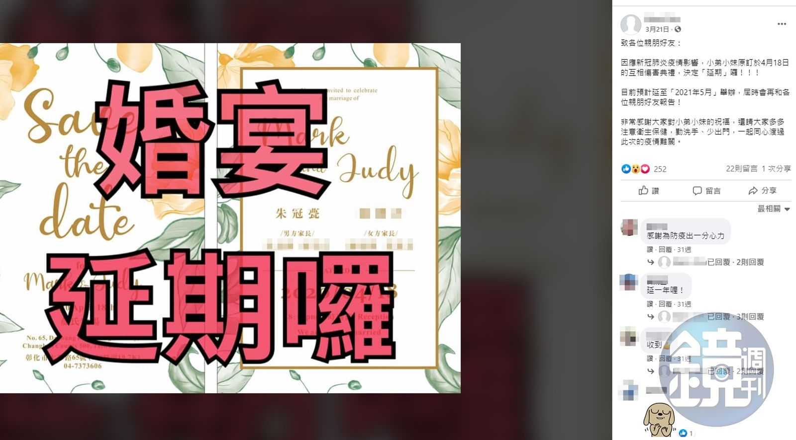 29歲的朱冠甍與妻子愛情長跑11年,去年生下女兒,原訂雙方要在今年4月舉辦婚禮,意外因武漢肺炎(亦稱新冠肺炎,COVID-19)疫情擾亂計畫,改到明年5月。一家三口事前拍好婚紗照,如今卻也因一場事故,讓朱冠甍與妻女天人永隔,無緣參加自己的婚禮。
