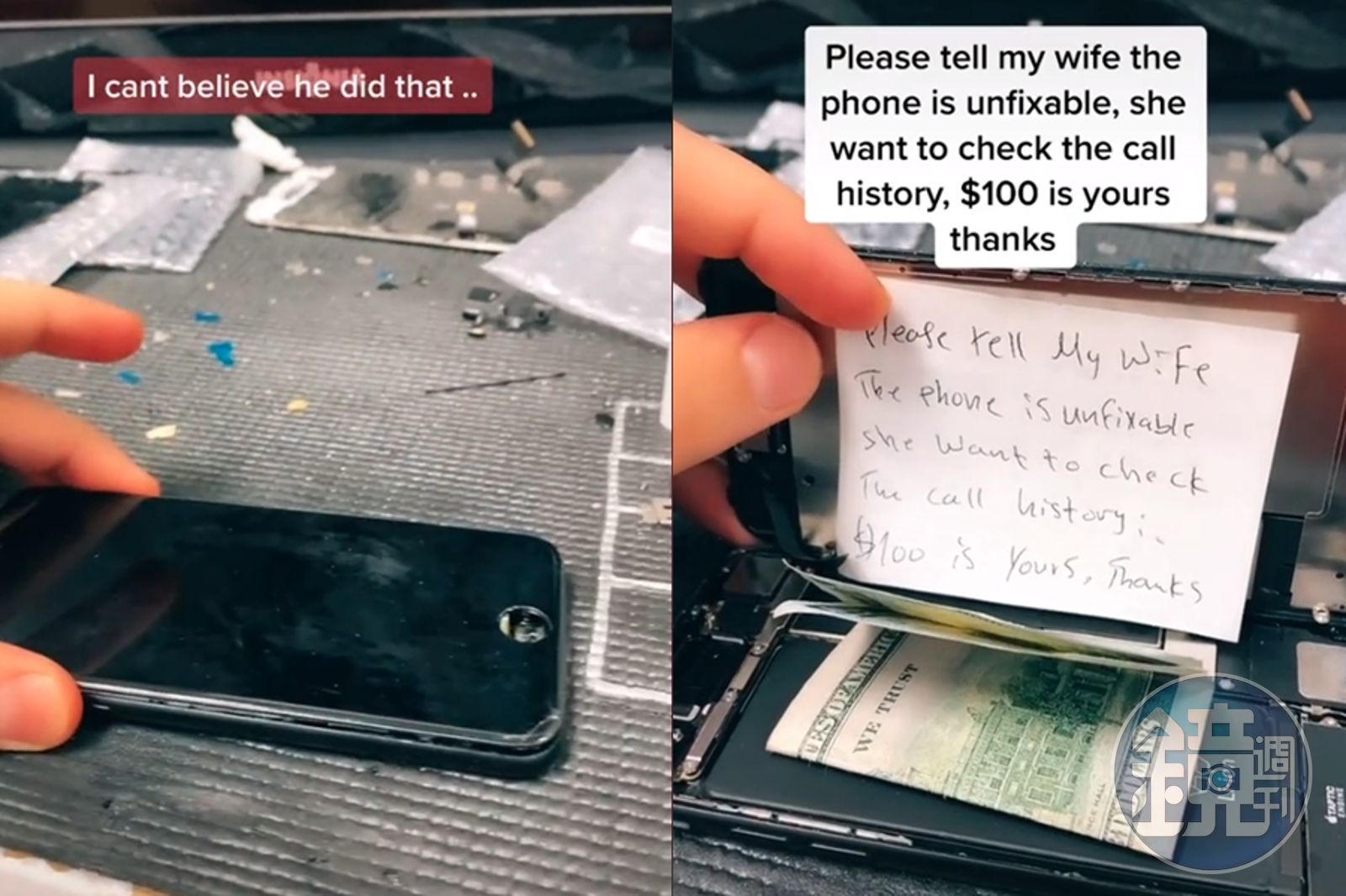 維修員表示,他在打開iPhone的背殼後,發現老公在裡面放了一張百元鈔,還有一張紙條,紙條上面要求維修員告訴他老婆這個手機已經壞到不能修,因為他老婆想要看手機裡面的紀錄,如果維修員照做,就可以拿到100美元。