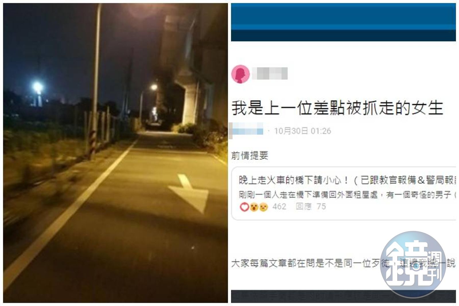 該女大生今天也在Dcard發文表示,「我是上一位差點被抓走的女生。她指出,如果依照手臂都是肉的情形應該是同一人,但是當天路燈太黑,我除了感覺到煙味和他手臂是肉的,其他真的看不清楚,歹徒背對我逃跑,我並沒有看到臉,也不能確定對方車的顏色。