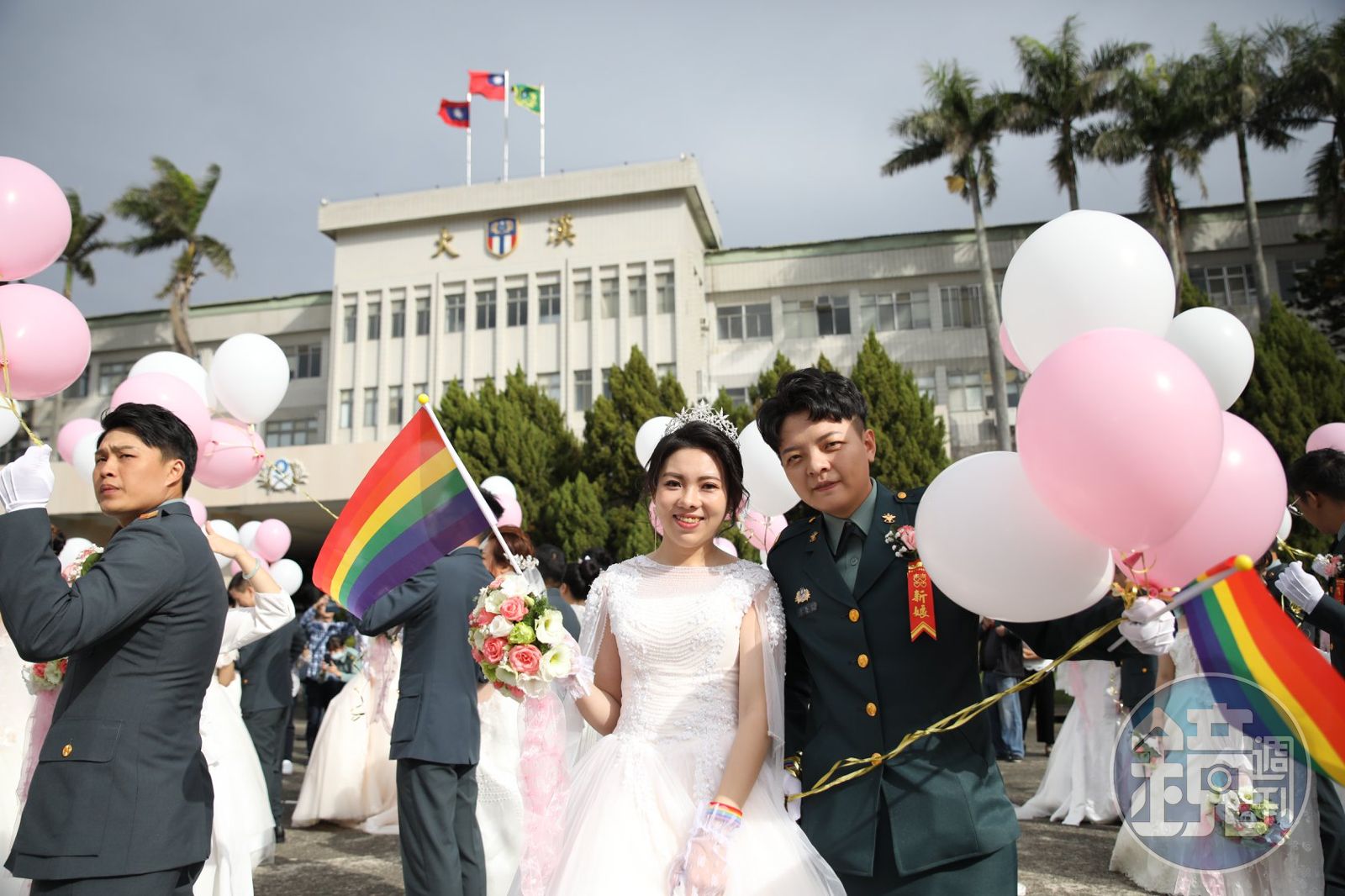婚禮上施放氣球,新人們陸陸續續步上紅毯,接受眾人祝福,其中王翊少校與配偶孟酉玫小姐,以及陳瑩宣中尉和配偶李沴稹小姐手拿彩虹旗進場,這也是聯合婚禮上難得出現的景象。