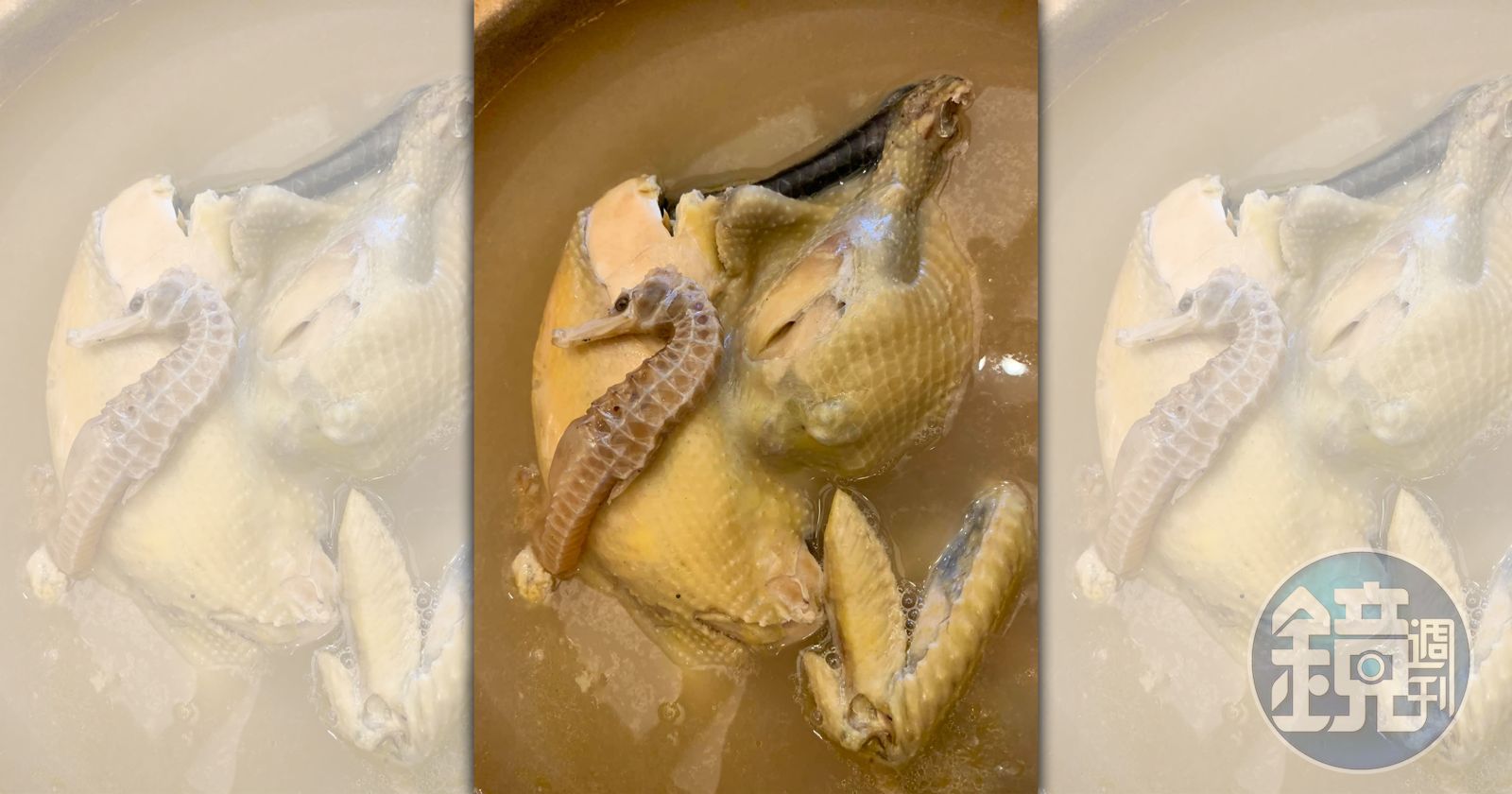 喝起來絕對不像驥園雞湯會黏嘴,反而是清甜有味,滋味無窮。這是我爸爸的做法,我只不過另加海馬。什麼時候加?雞入砂鍋後,才把海馬放進去,一開始它會浮在水面,接著湯滾浮浮沉沉,而後消失在黃金清湯中。