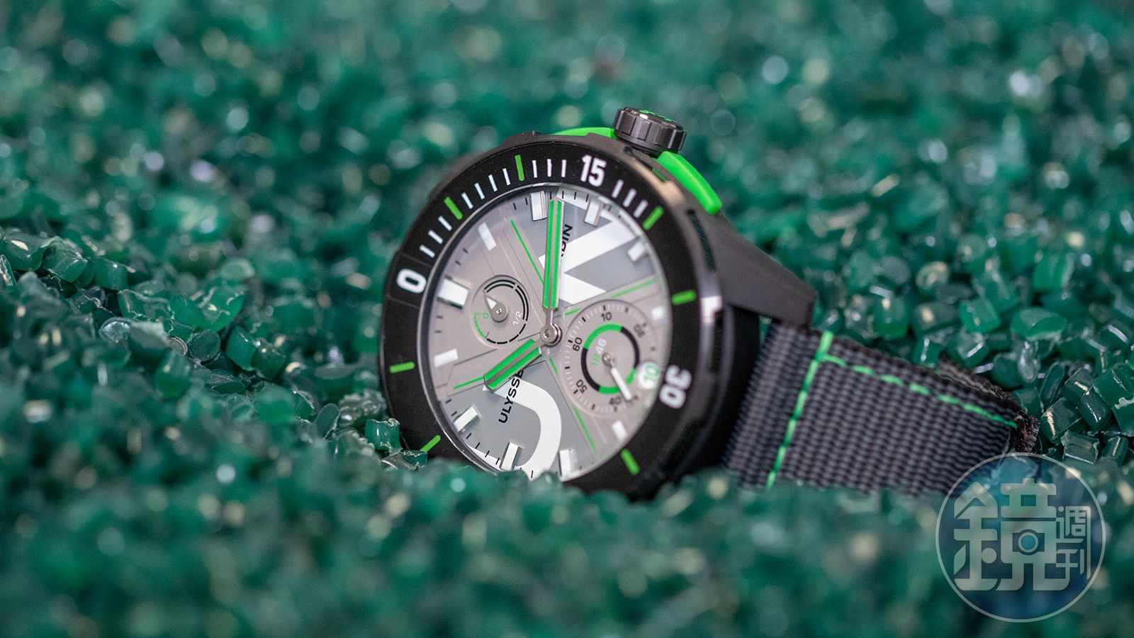 另外錶帶使用的也是環保材質,錶帶的原物料是海洋中的PET塑膠,製造商是瑞士TIDE公司,他們將這些廢棄塑膠再製而成的聚醯胺紗線編織成錶帶,同時也致力於停止生產全新塑膠製品的目標,從上游到下游都將環保概念執行得滿徹底。這次雅典在面盤玻璃材質上也加入變更,品牌以瑞士汝拉地區生產的透明陶瓷玻璃,取代傳統的藍寶石水晶玻璃,這種材質的生產過程對於環境的耗損相對比較不高,雅典也正在評估日後將它擴大運用到其他系列的可能。