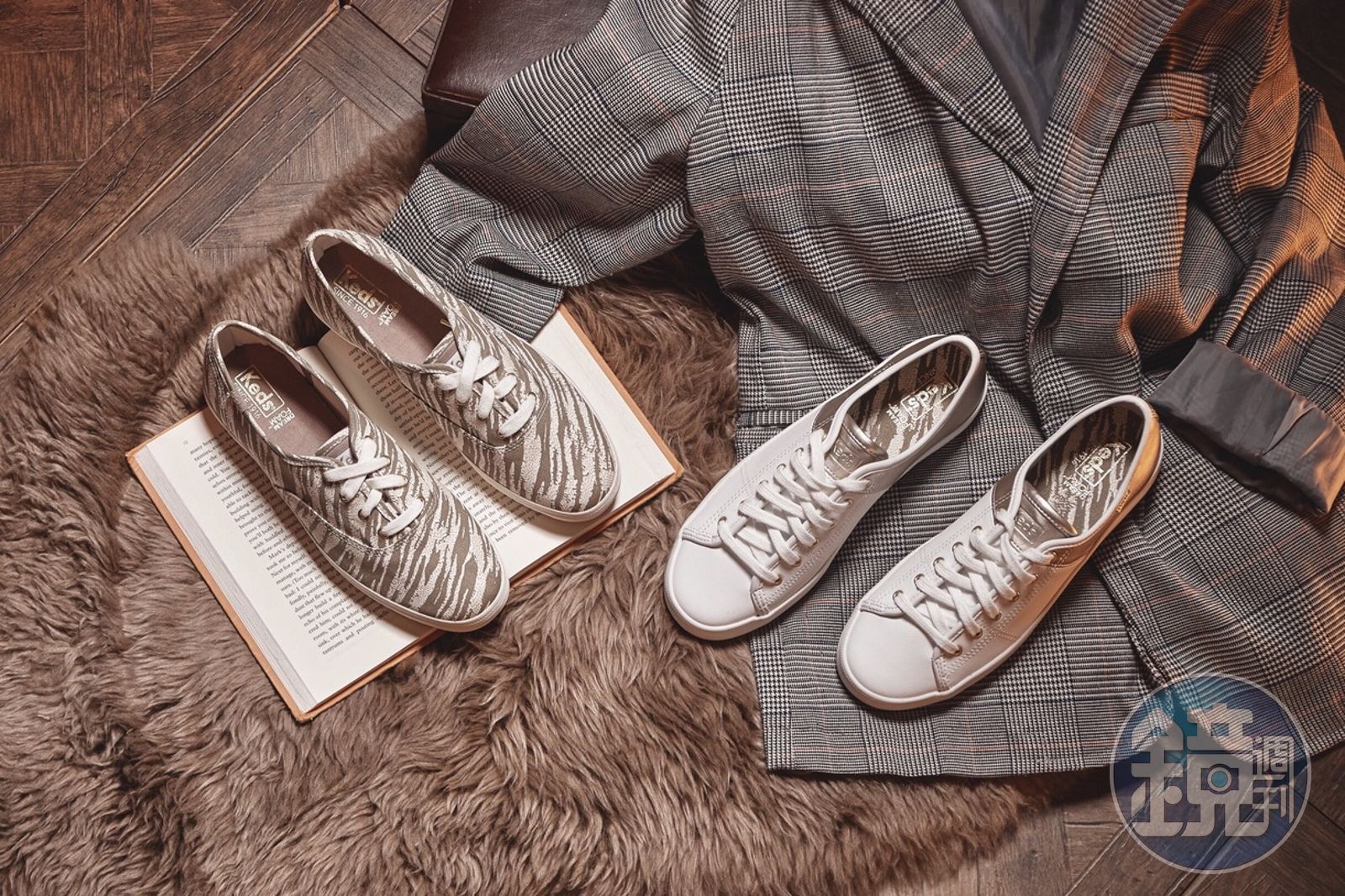 為了呼應秋冬季節,Keds推出動物紋與復古格紋的休閒鞋,來搭配較厚重的打扮。此外,黑色或是霧感香檳金屬色的皮革款式,相較帆布材質,更多了一份帥氣的感覺。