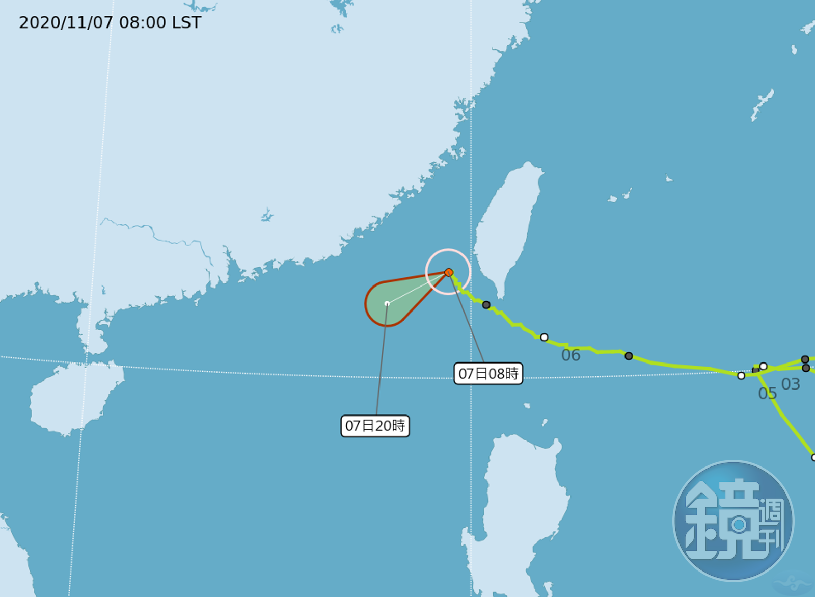 根據最新氣象資料顯示,第20號輕度颱風閃電過去3小時強度略為減弱且暴風圈亦較縮小,中心目前在鵝鑾鼻西北西方海面,向西南西移動,臺灣本島已脫離暴風圈,對台灣海峽仍構成威脅。預計此颱風強度仍有持續減弱的趨勢。
